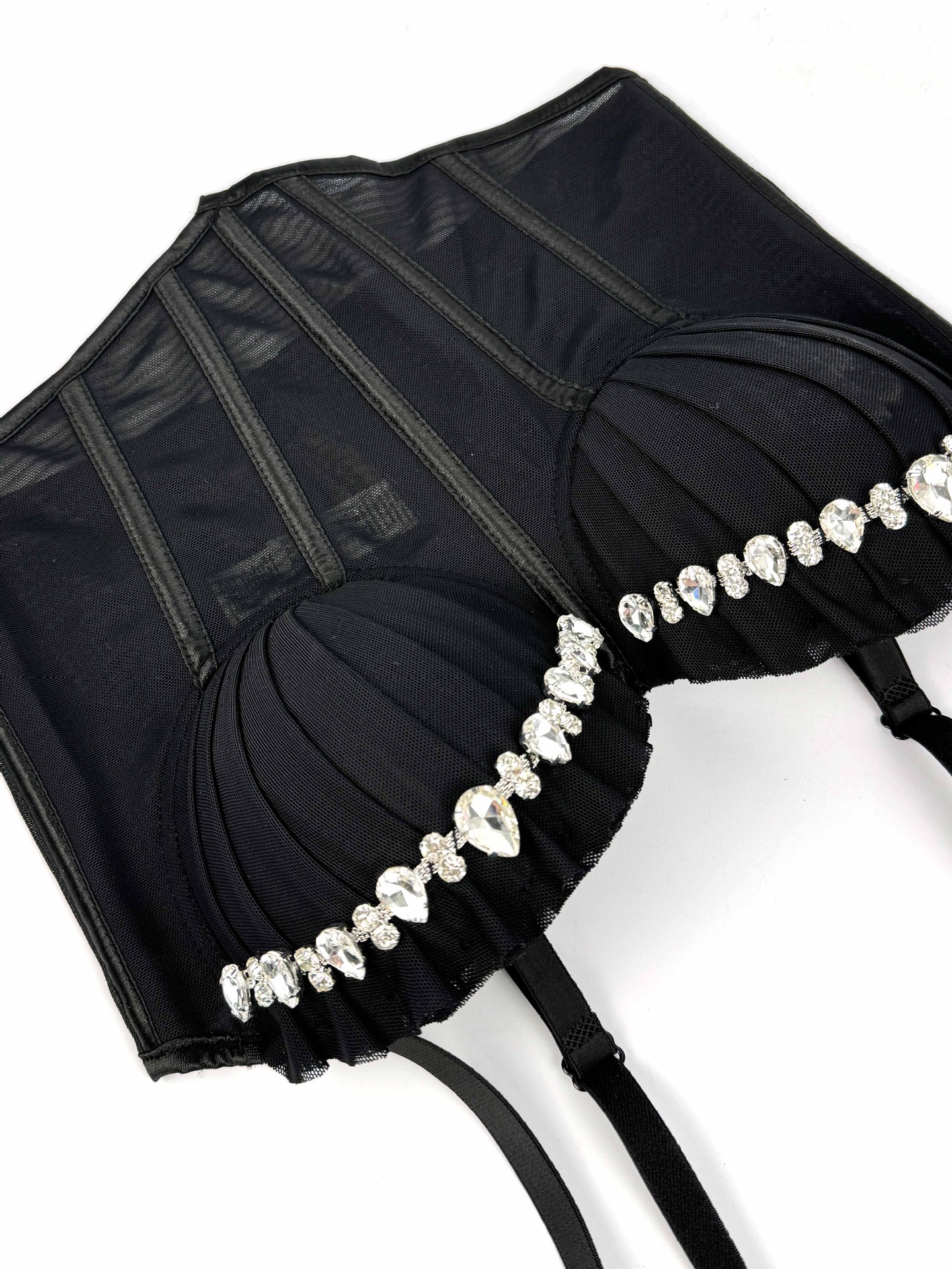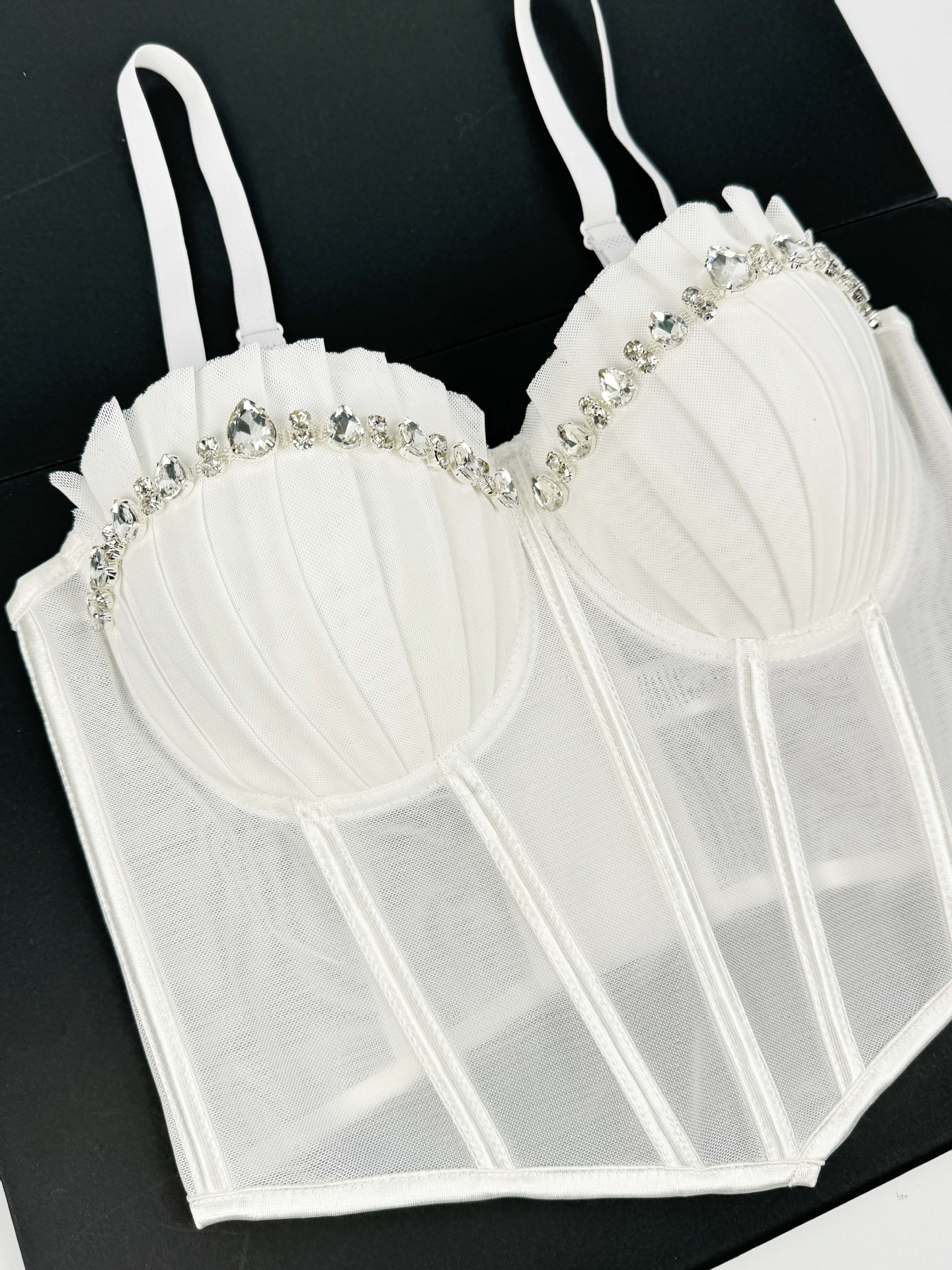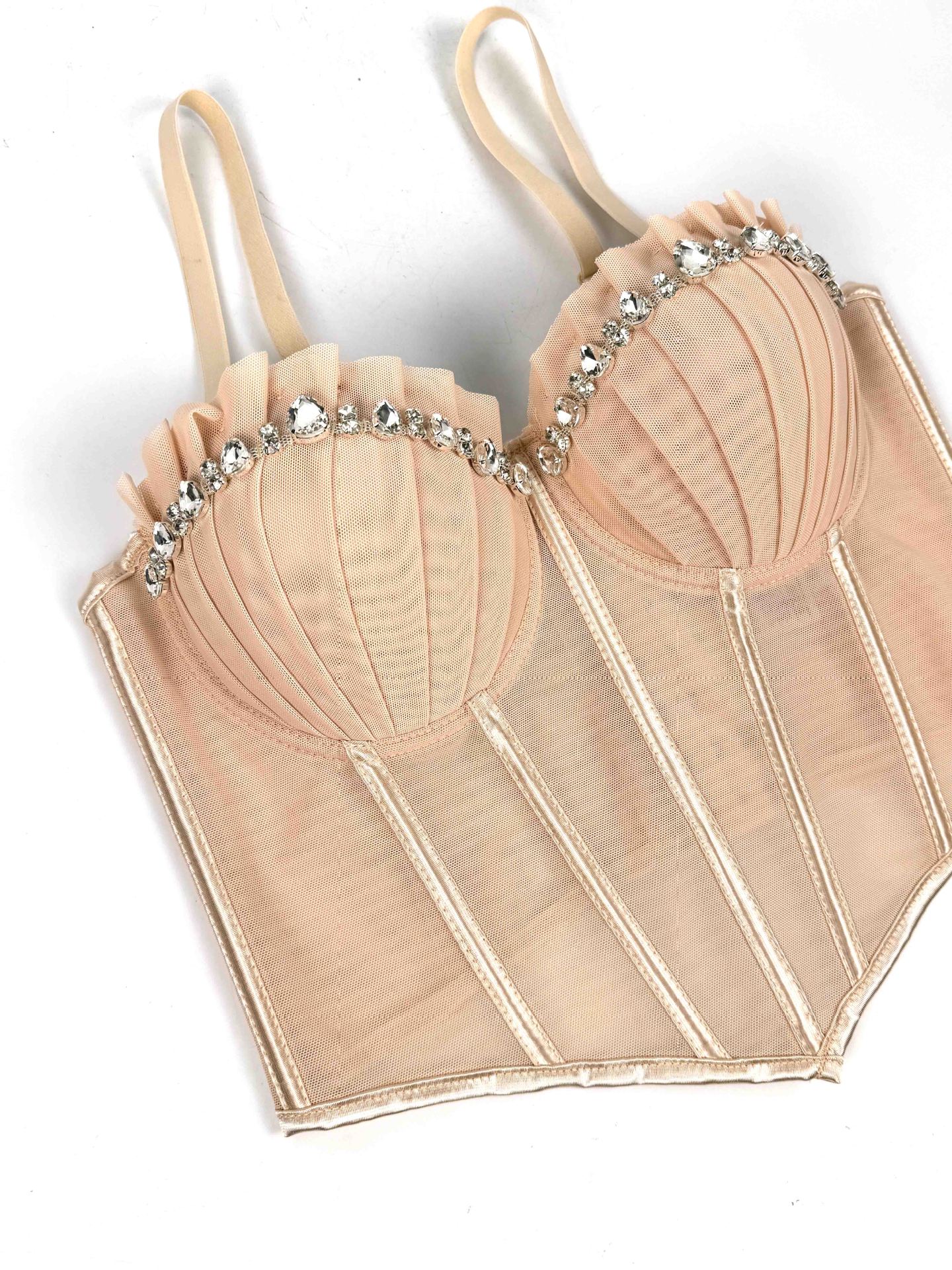 Élément : Strass, baleines, dentelle/tulle/résille, pliage, fermeture à crochet