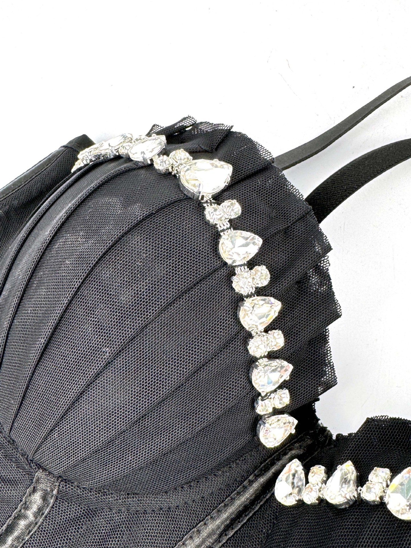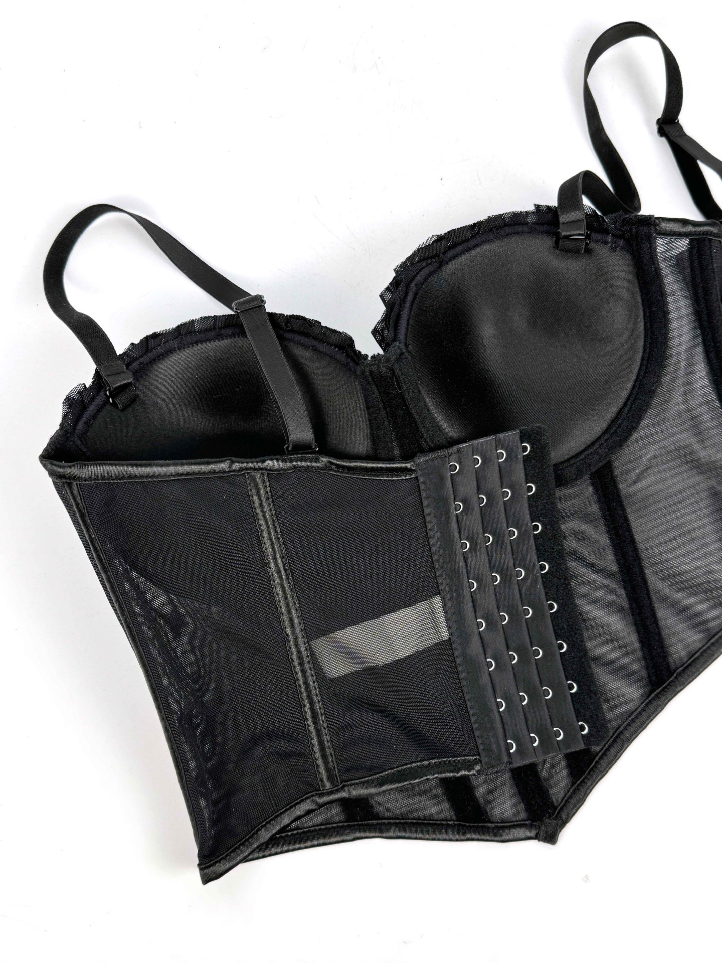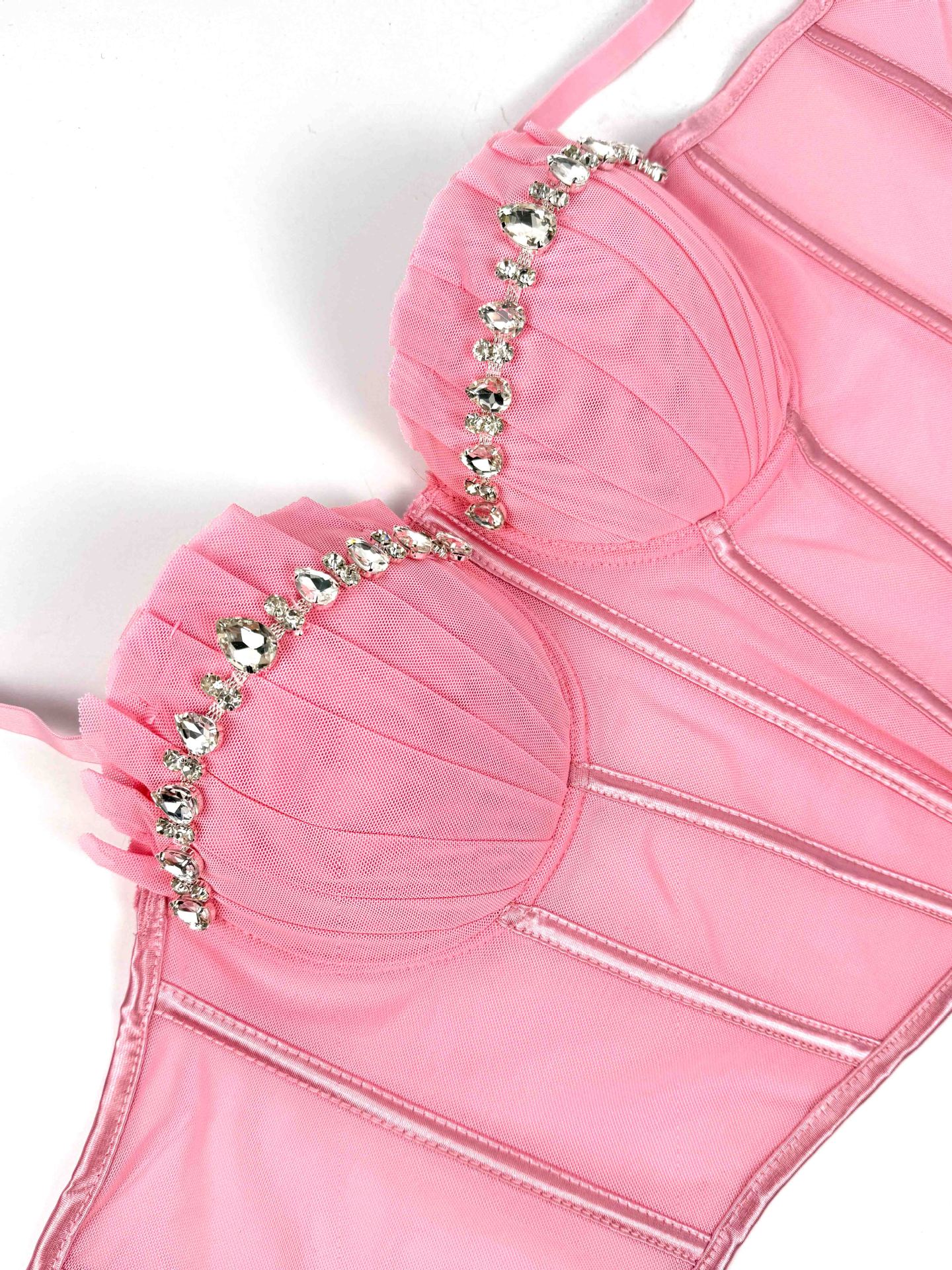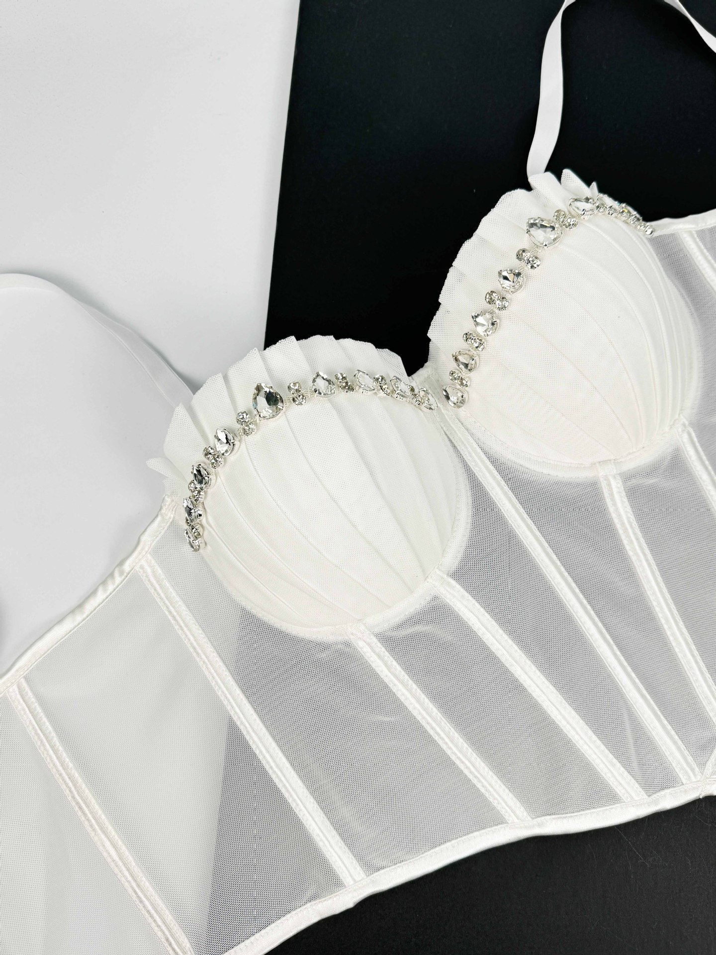 Élément : Strass, baleines, dentelle/tulle/résille, pliage, fermeture à crochet