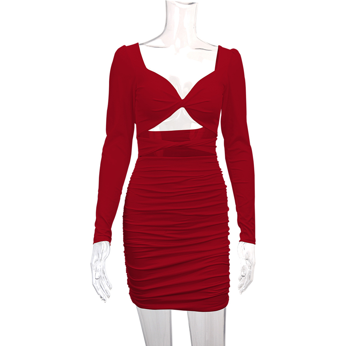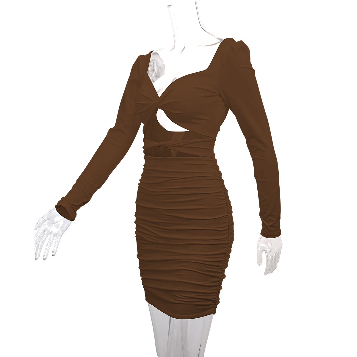 Autumn Winter Arrival Women Clothing V neck Hollow Out Cutout Pleated Dress