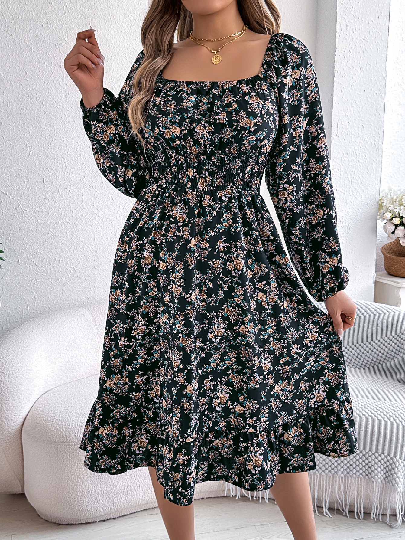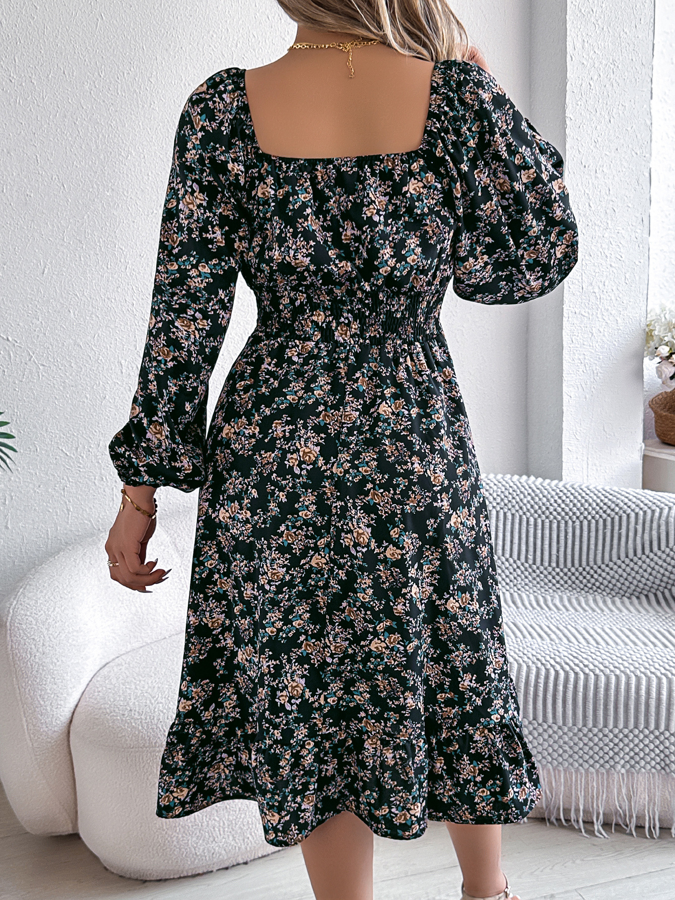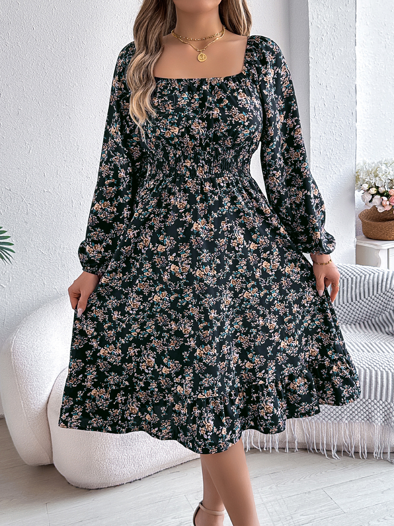 Autumn Winter Elegant Floral Square Collar Long Sleeve Waist Trimming Ruffles A line Women Clothing