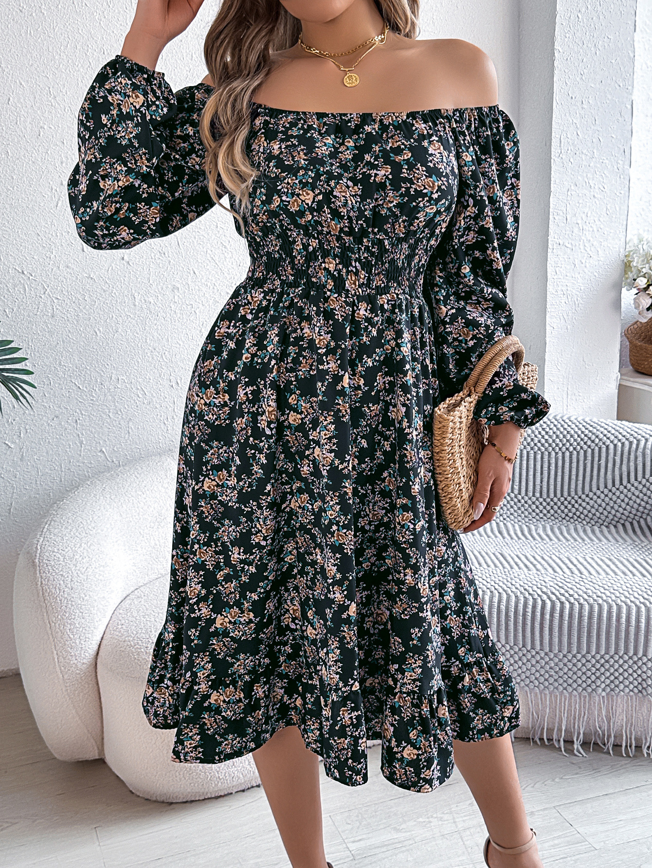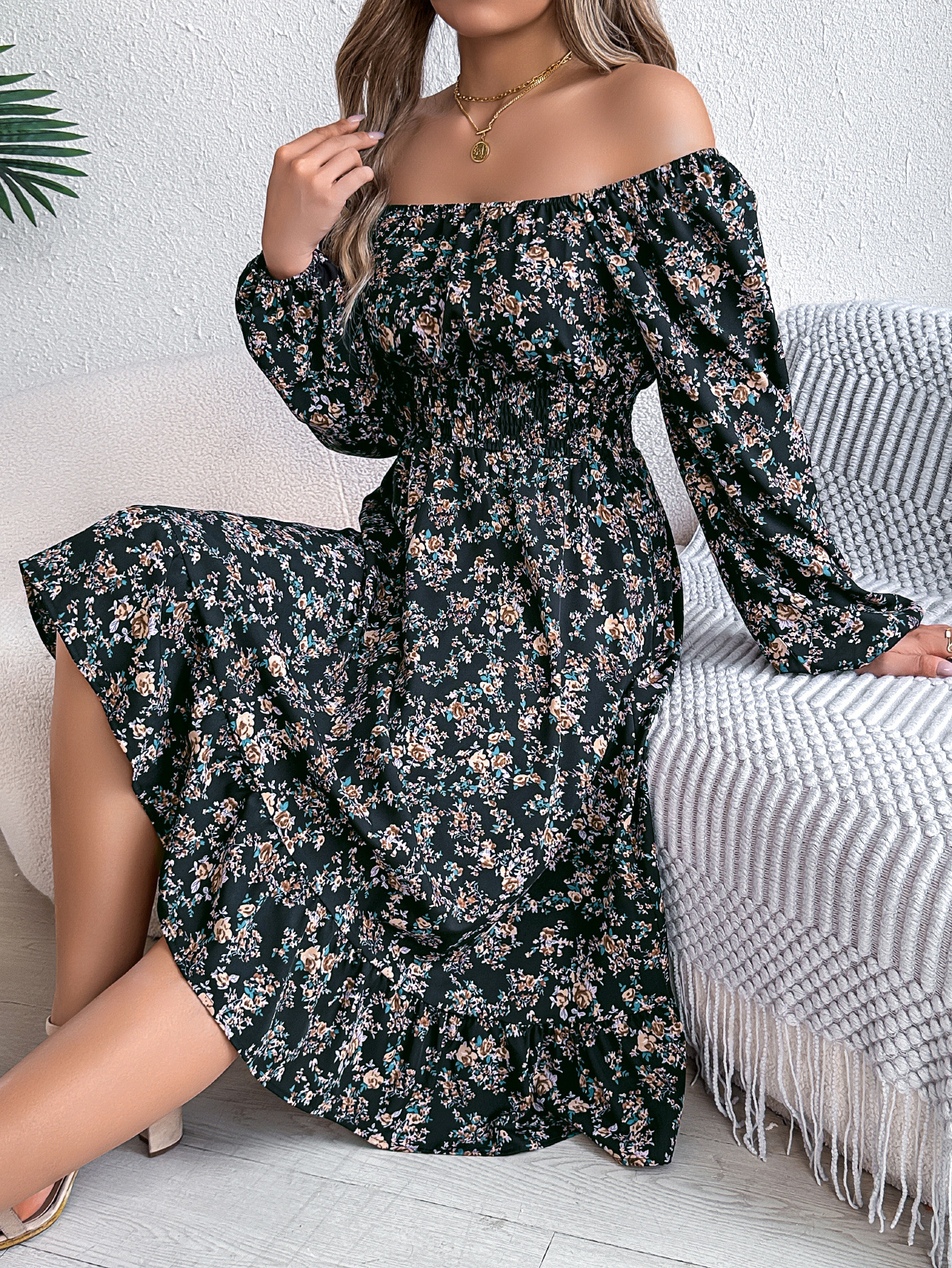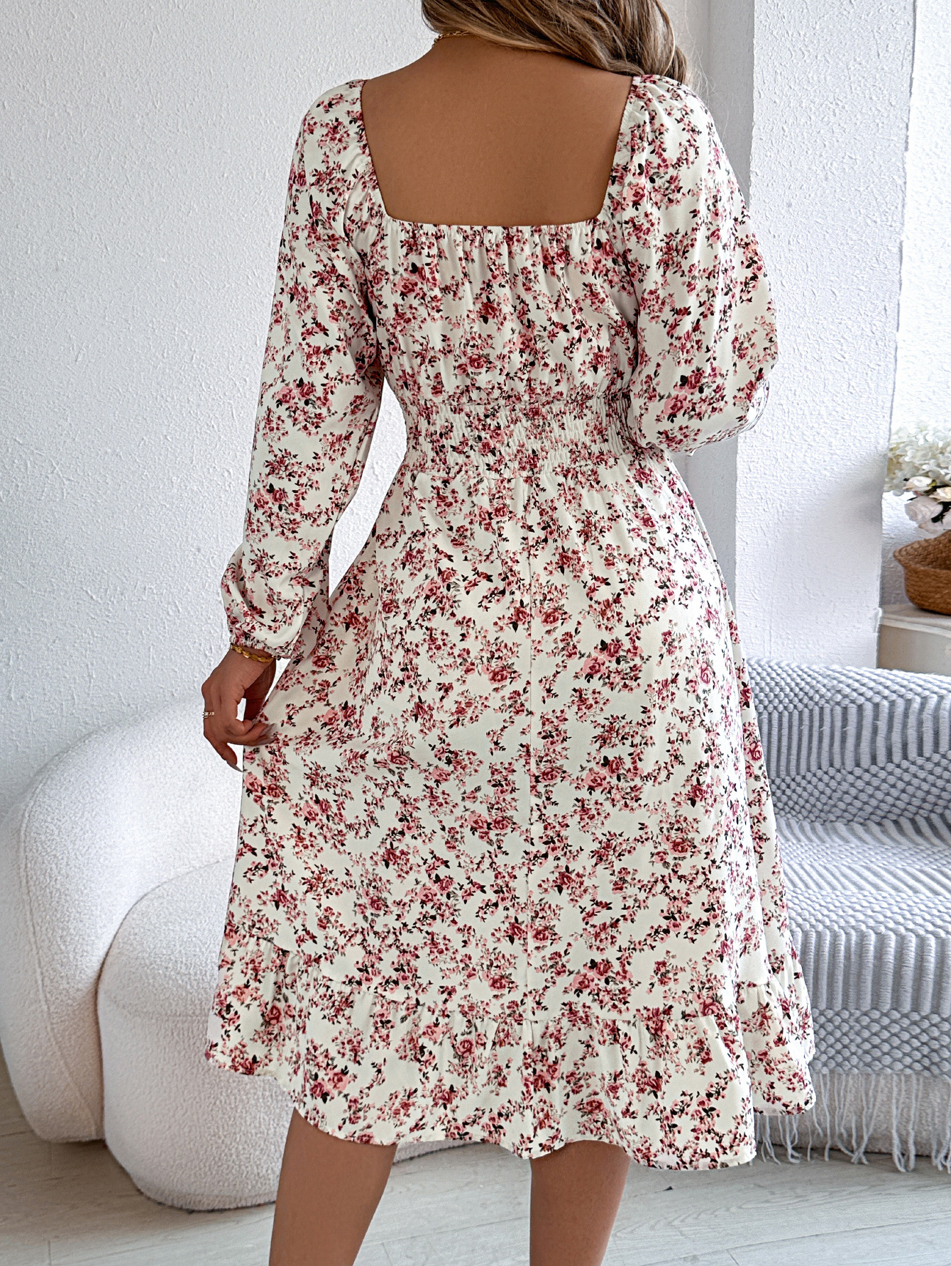 Autumn Winter Elegant Floral Square Collar Long Sleeve Waist Trimming Ruffles A line Women Clothing