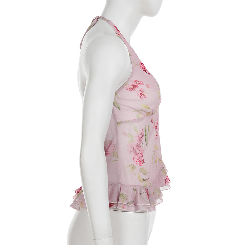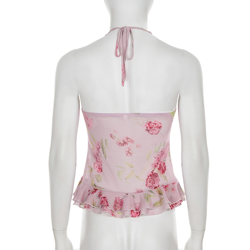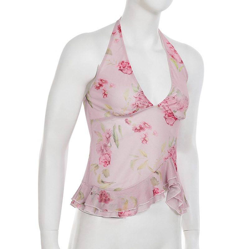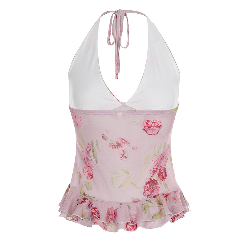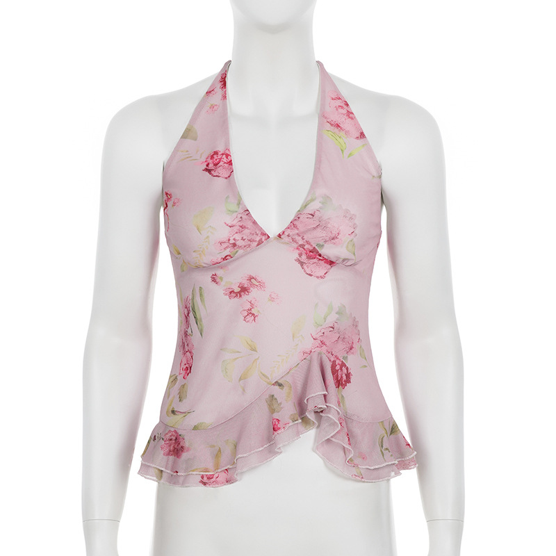 Holiday Net Yarn Floral Printed Irregular Asymmetric Ruffled Halter Spaghetti Straps Sexy V neck Top for Women