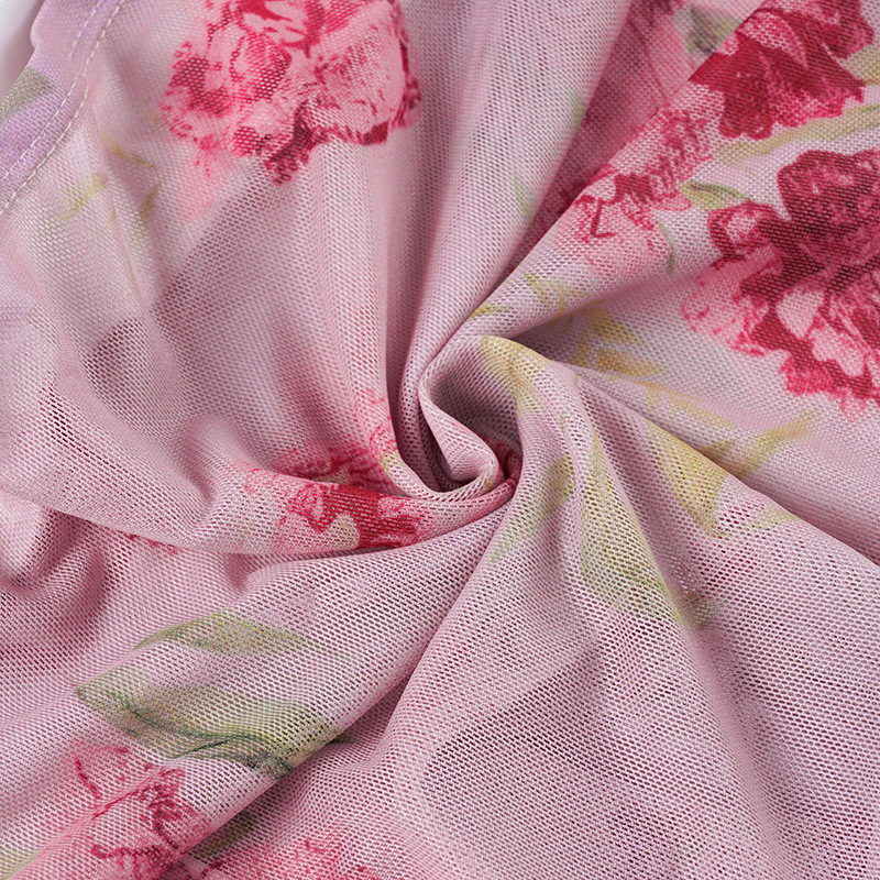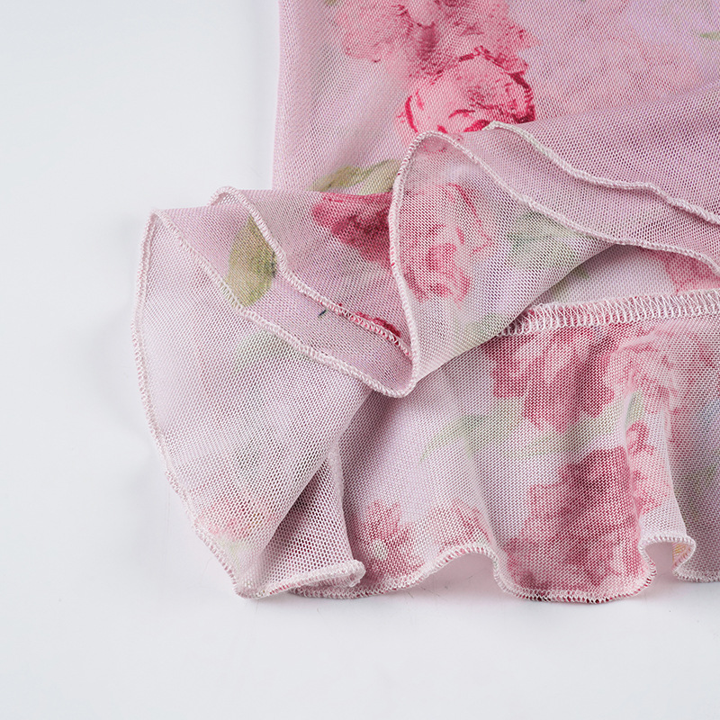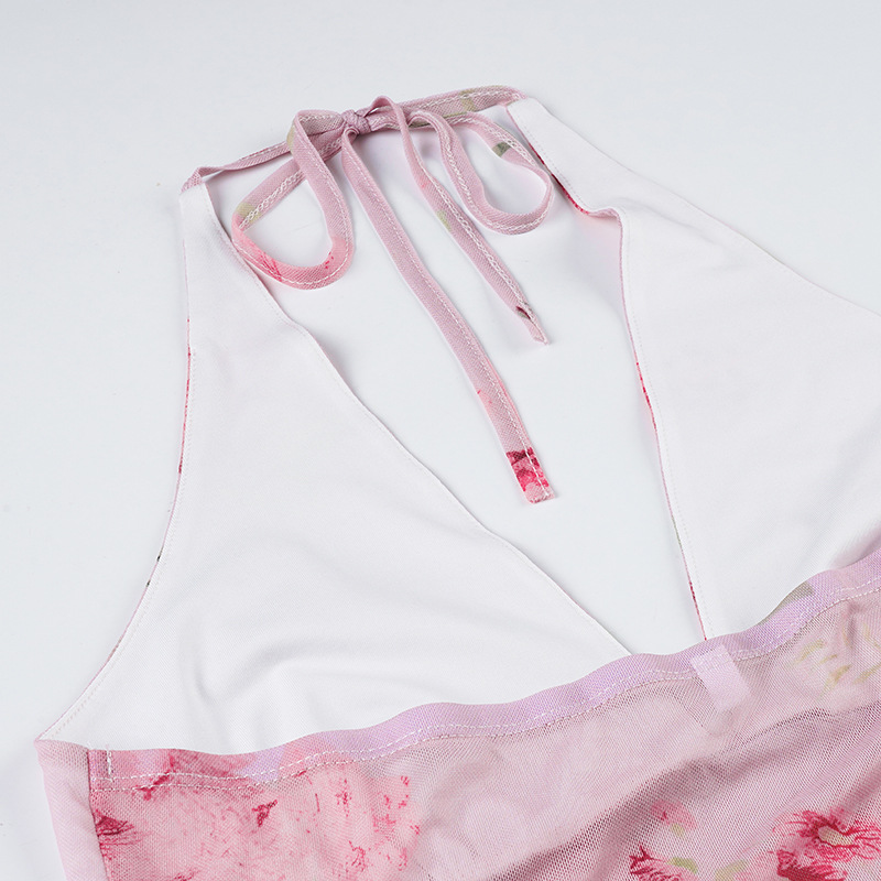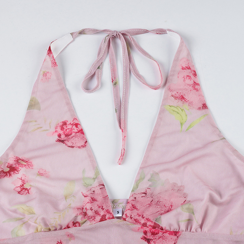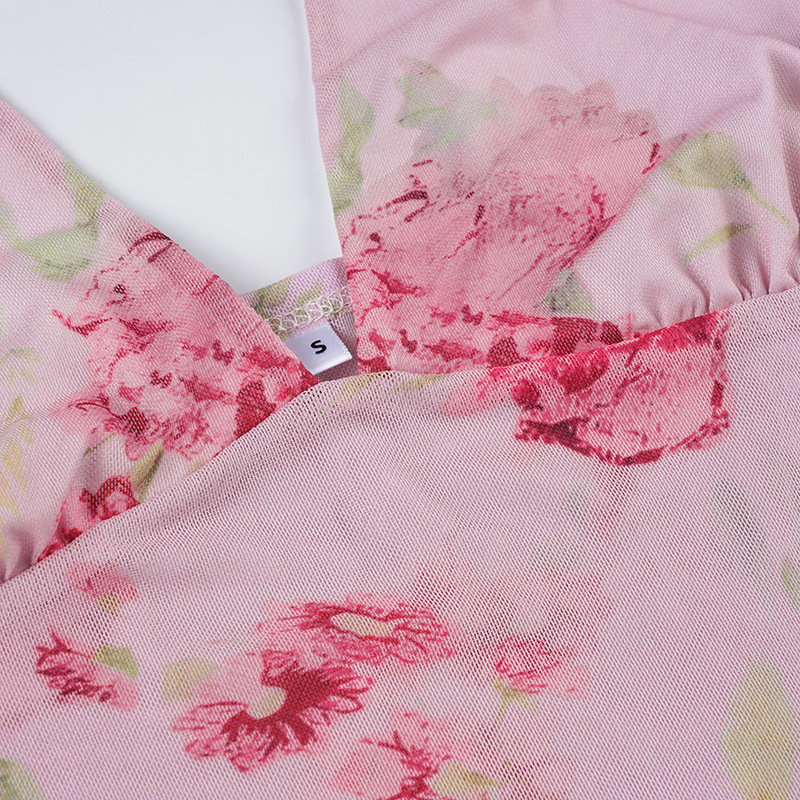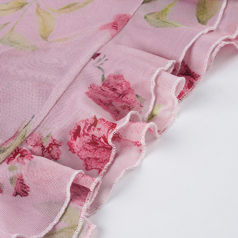 Holiday Net Yarn Floral Printed Irregular Asymmetric Ruffled Halter Spaghetti Straps Sexy V neck Top for Women