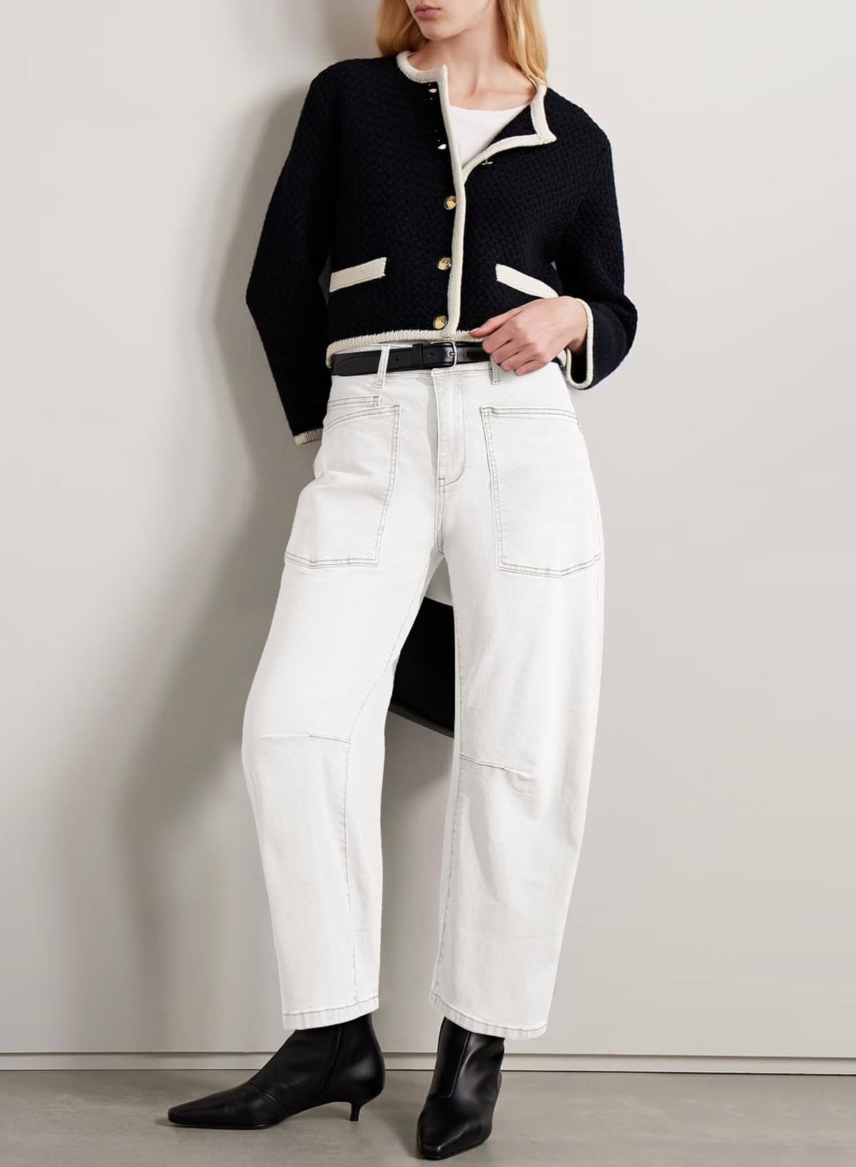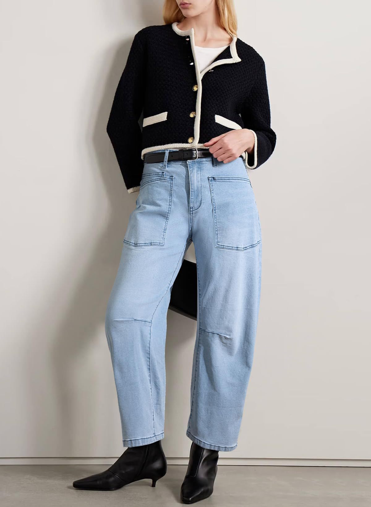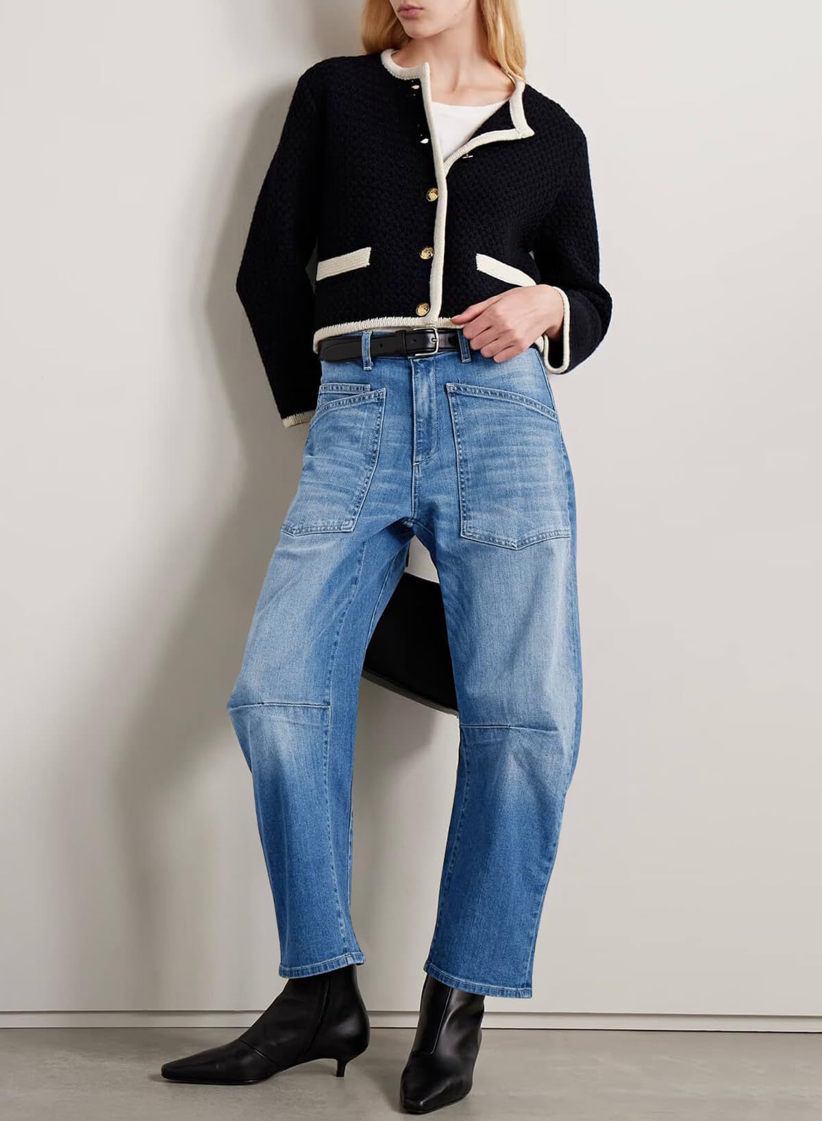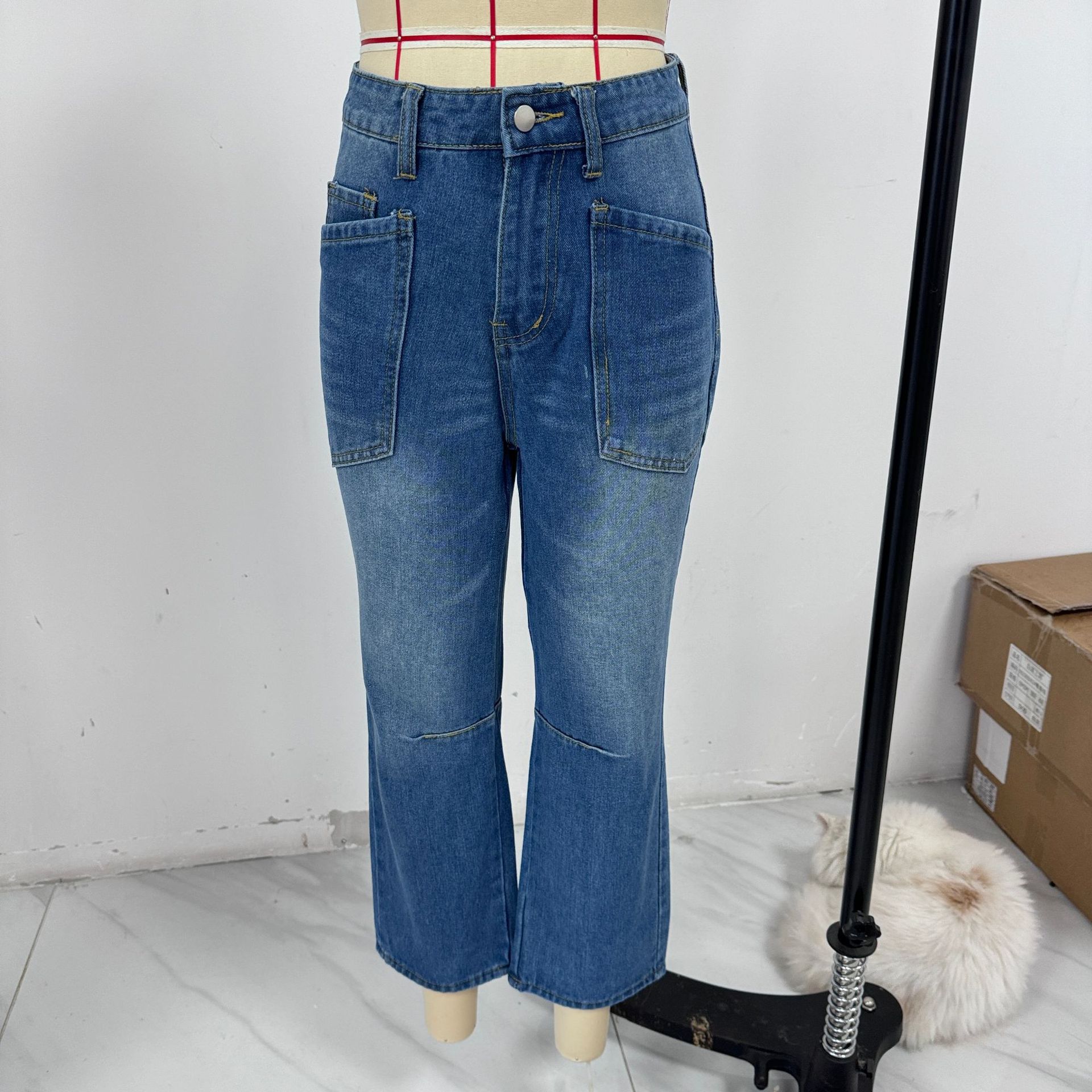 Retro Deconstruction Tooling Patch Pocket Washed Curved High Waist Jeans Women
