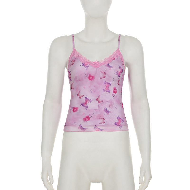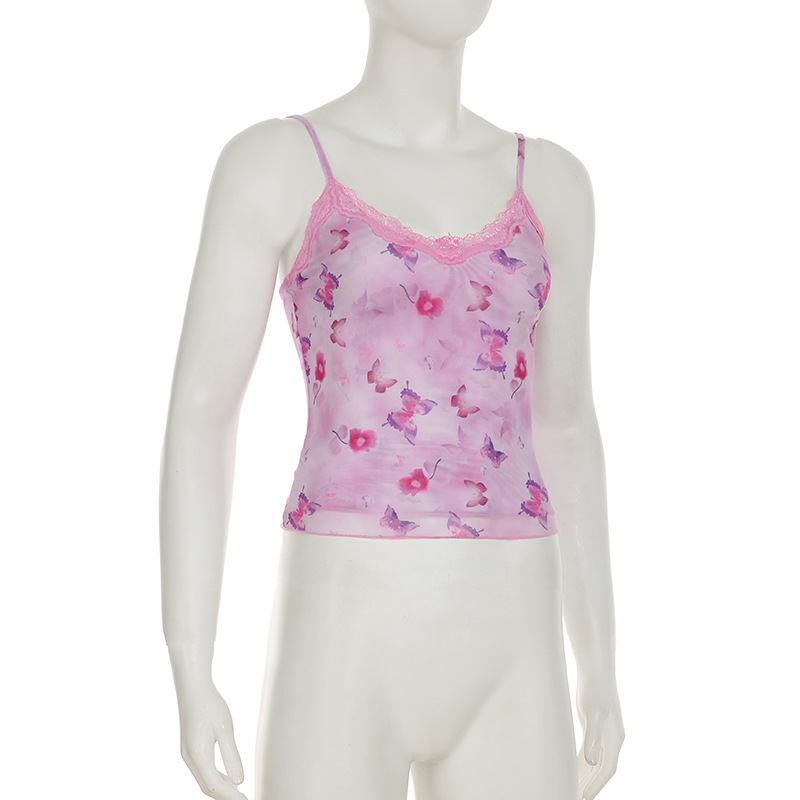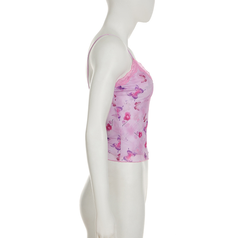 Sexy Butterfly Print Lace V neck Mesh Vest Sexy Sexy Backless Slim Fit Outer Wear Sling