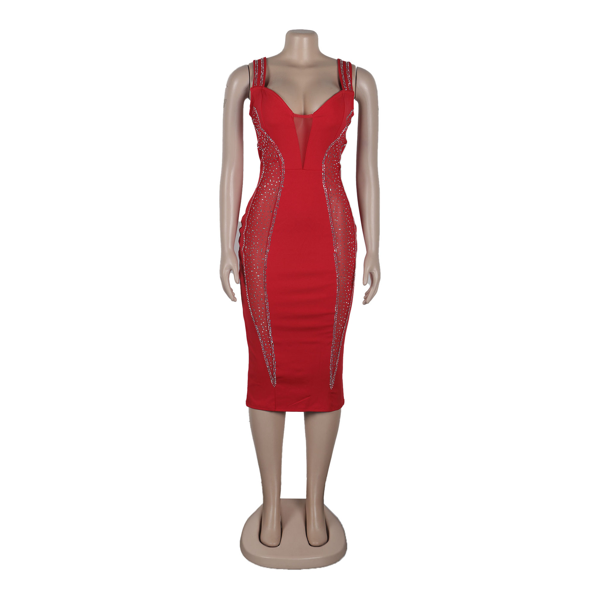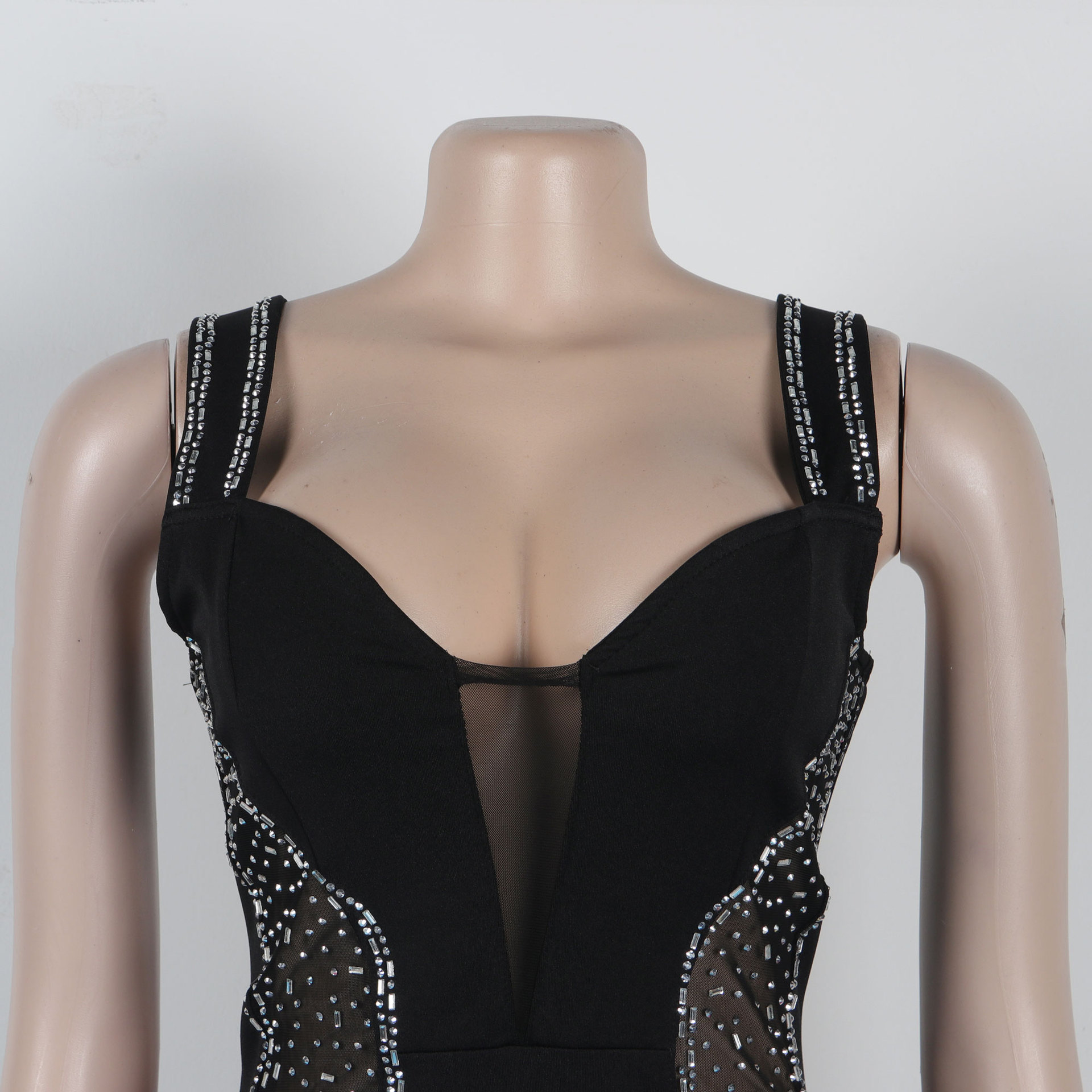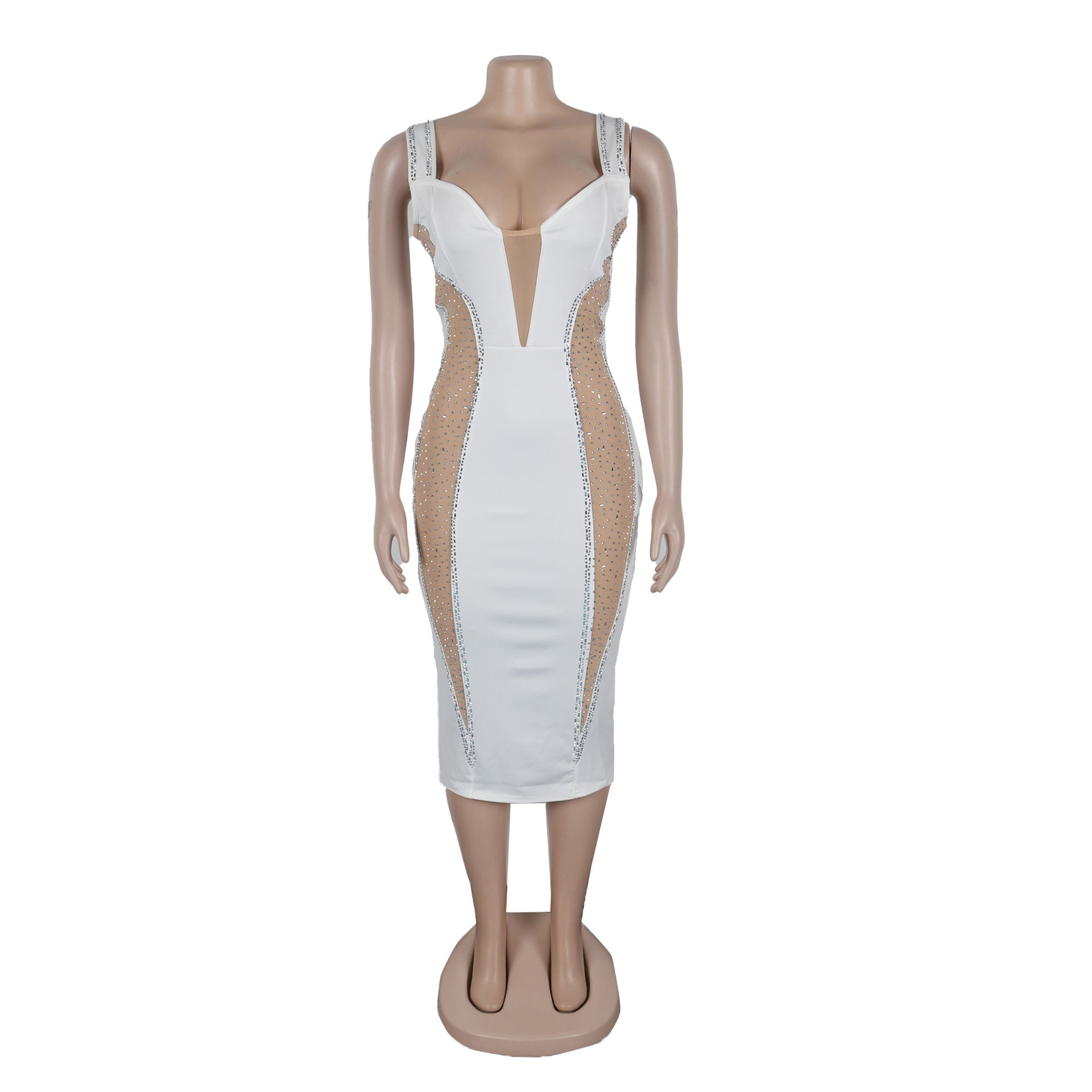 Sexy Rhinestone Stitching Hollow Out Cutout Out See Through Hip Stretch Slim Strap Dress