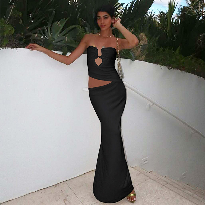 Sexy Tube Top Stitching Steel Ring Cropped Outfit Sheath Long Adult Lady like Woman Dress Women