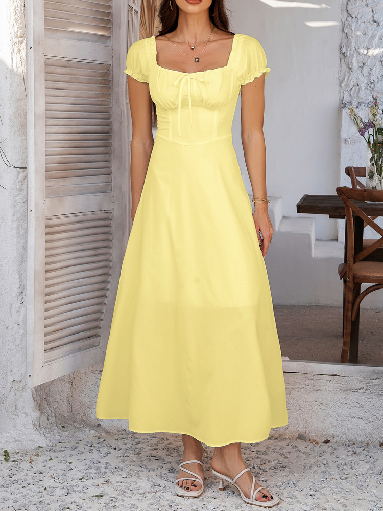 Spring Summer Elegant Solid Color Tied Pleating Puff Sleeve French Dress Women Clothing