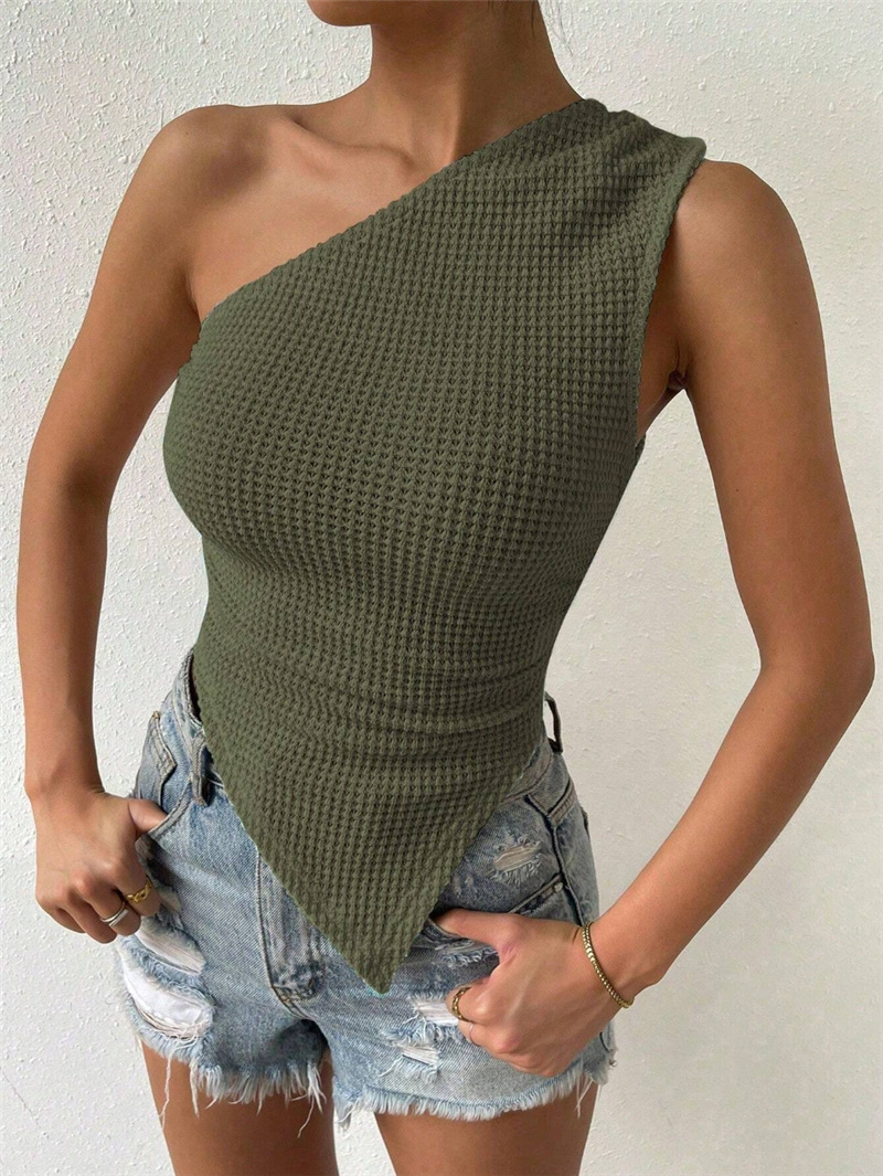 Spring Summer One Shoulder Asymmetric Hem Knitted Sleeveless Top T shirt Vest