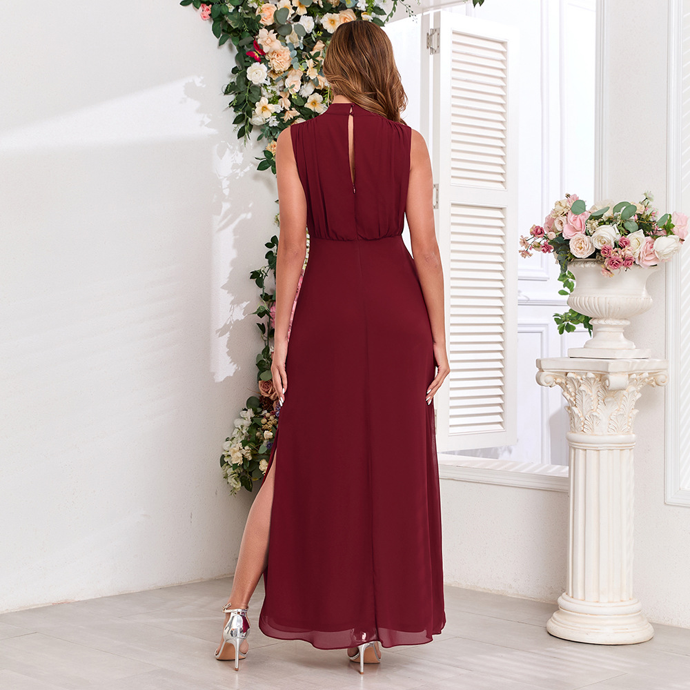 Spring Summer Stand Collar Sleeveless Elegant Chiffon Evening Dress Back Zipper Double Slit Large A Swing Full Slip Dress