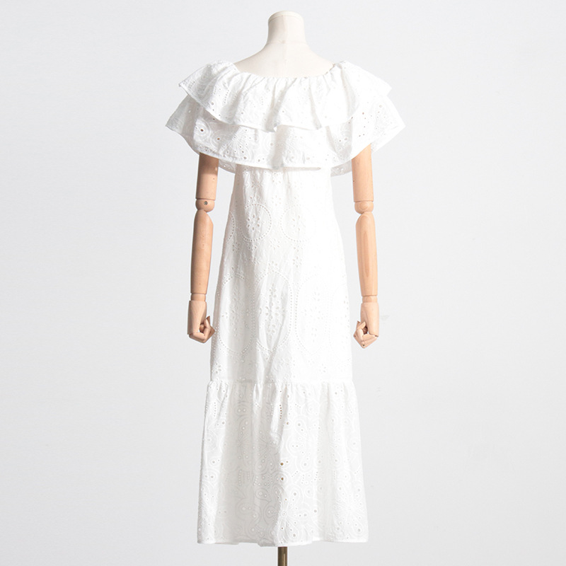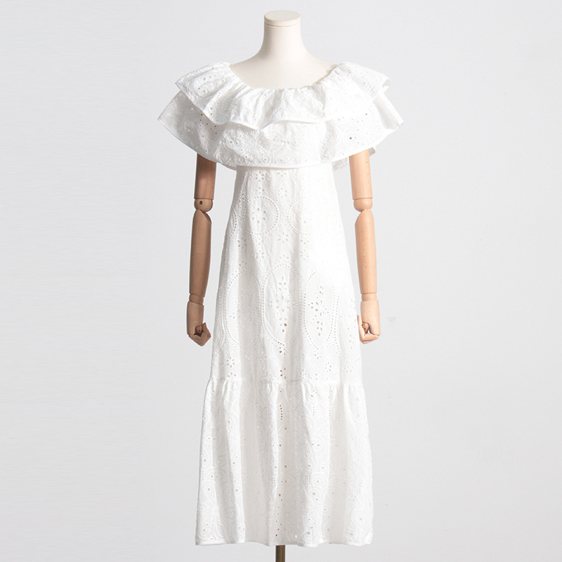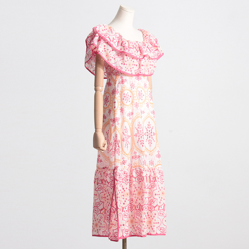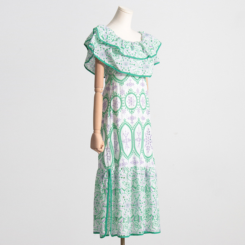 Summer off Shoulder Ruffled Hollow Out Cutout Embroidered Printed Front Slit Dress Elegant Dress
