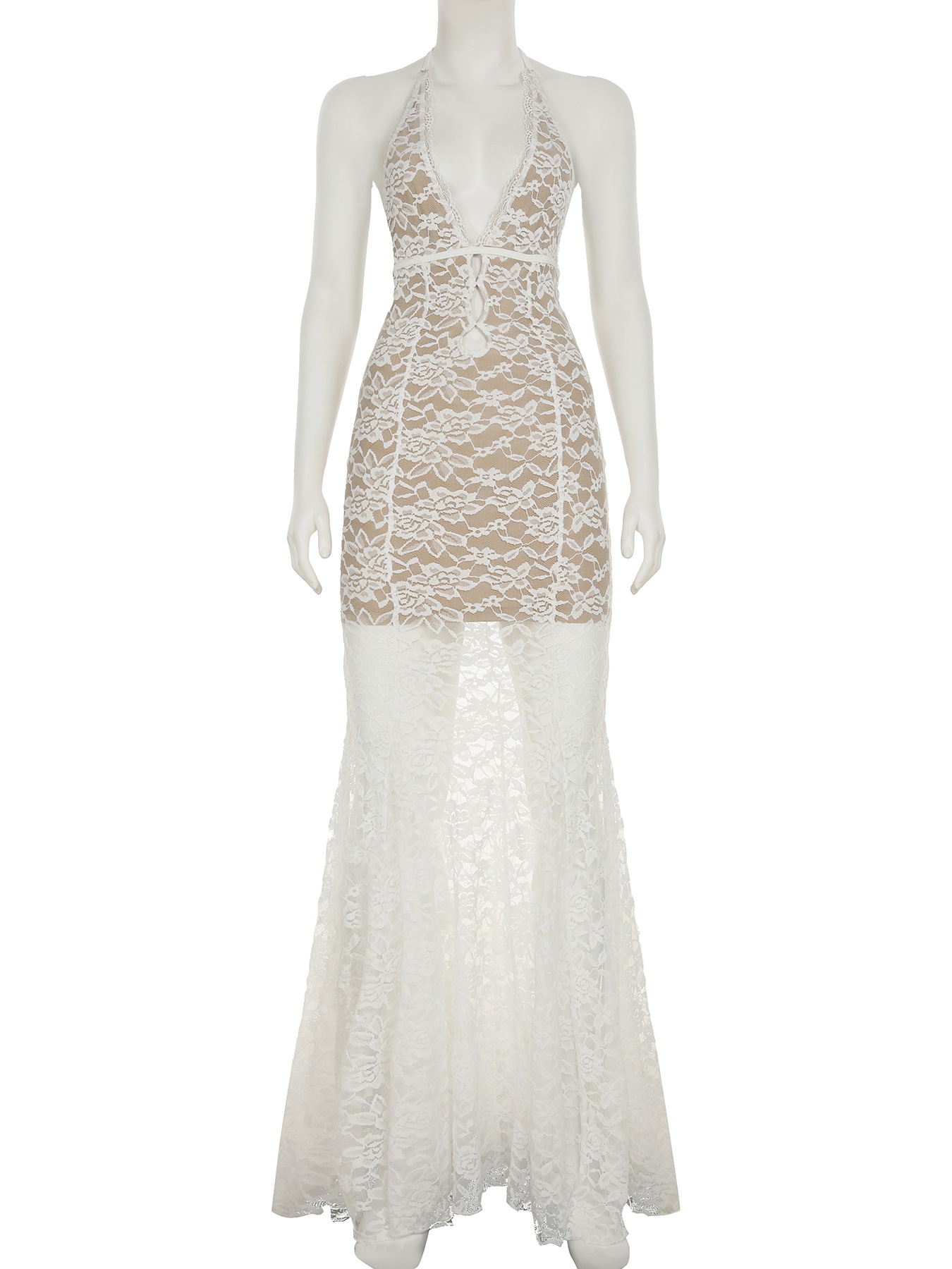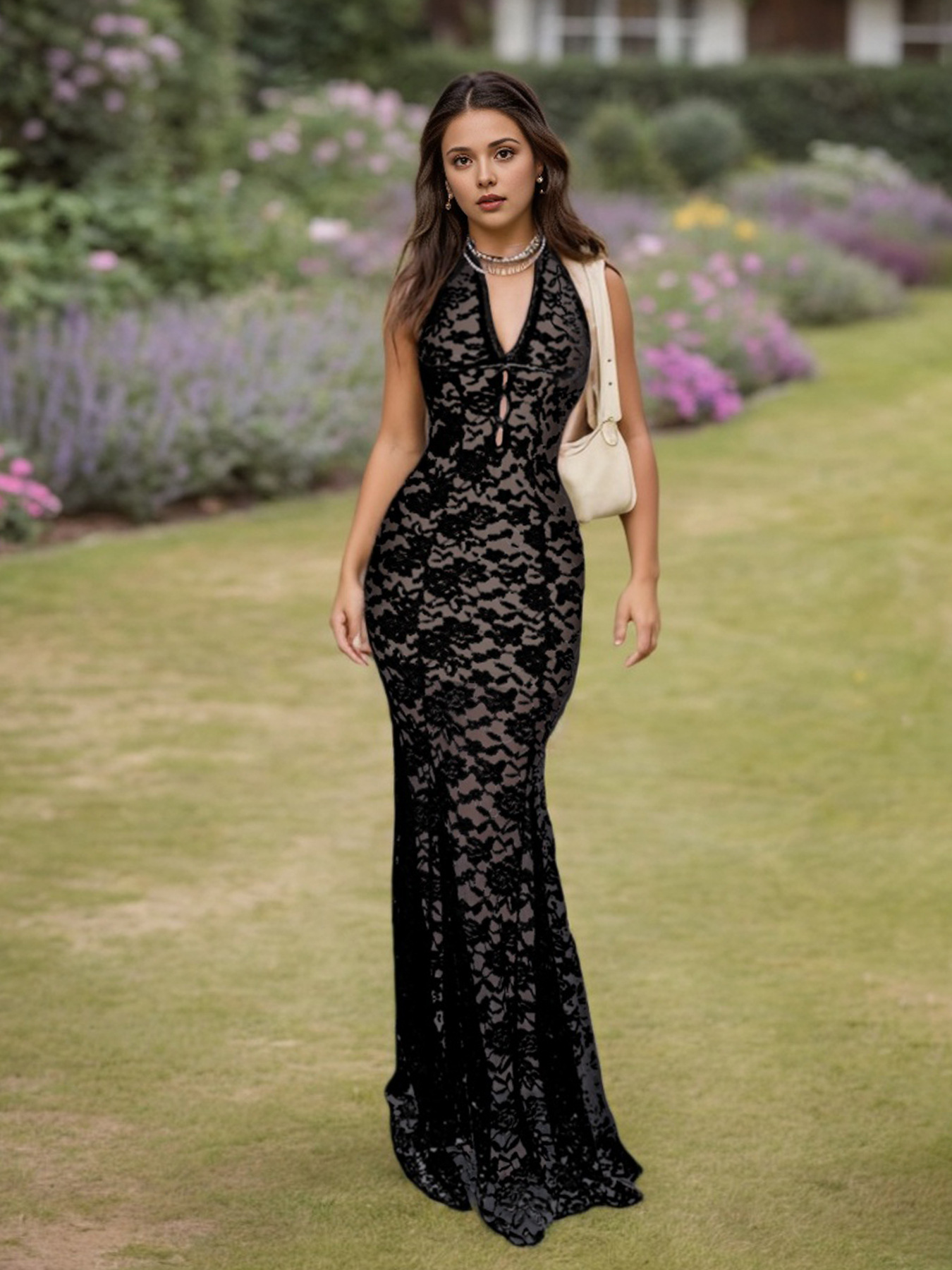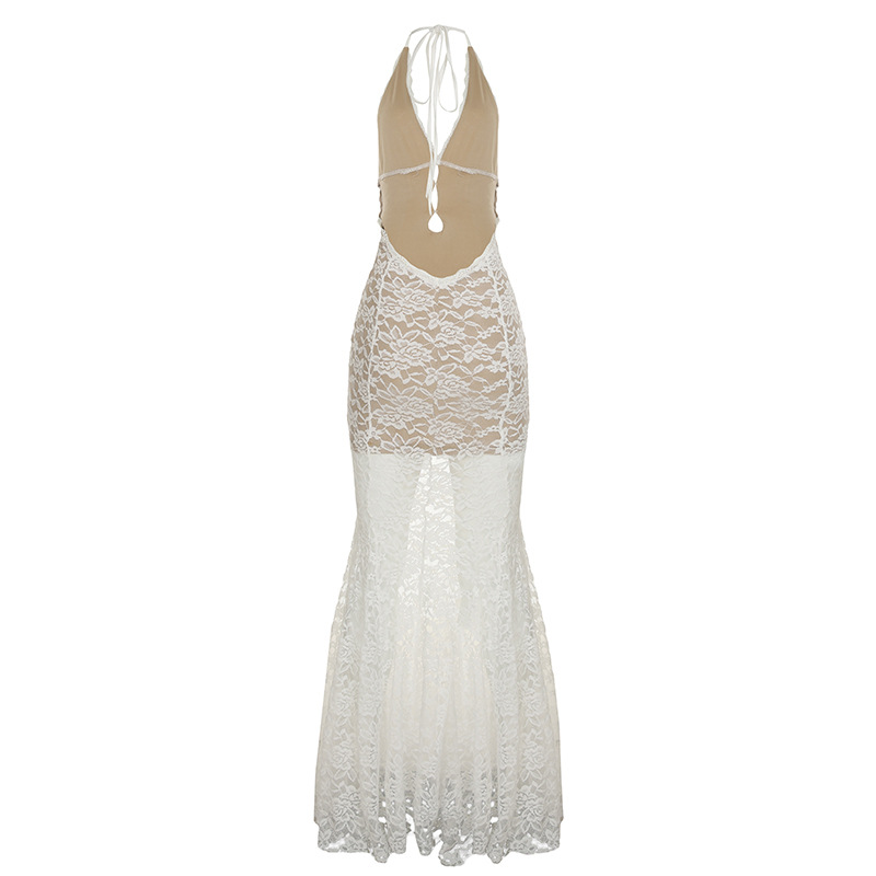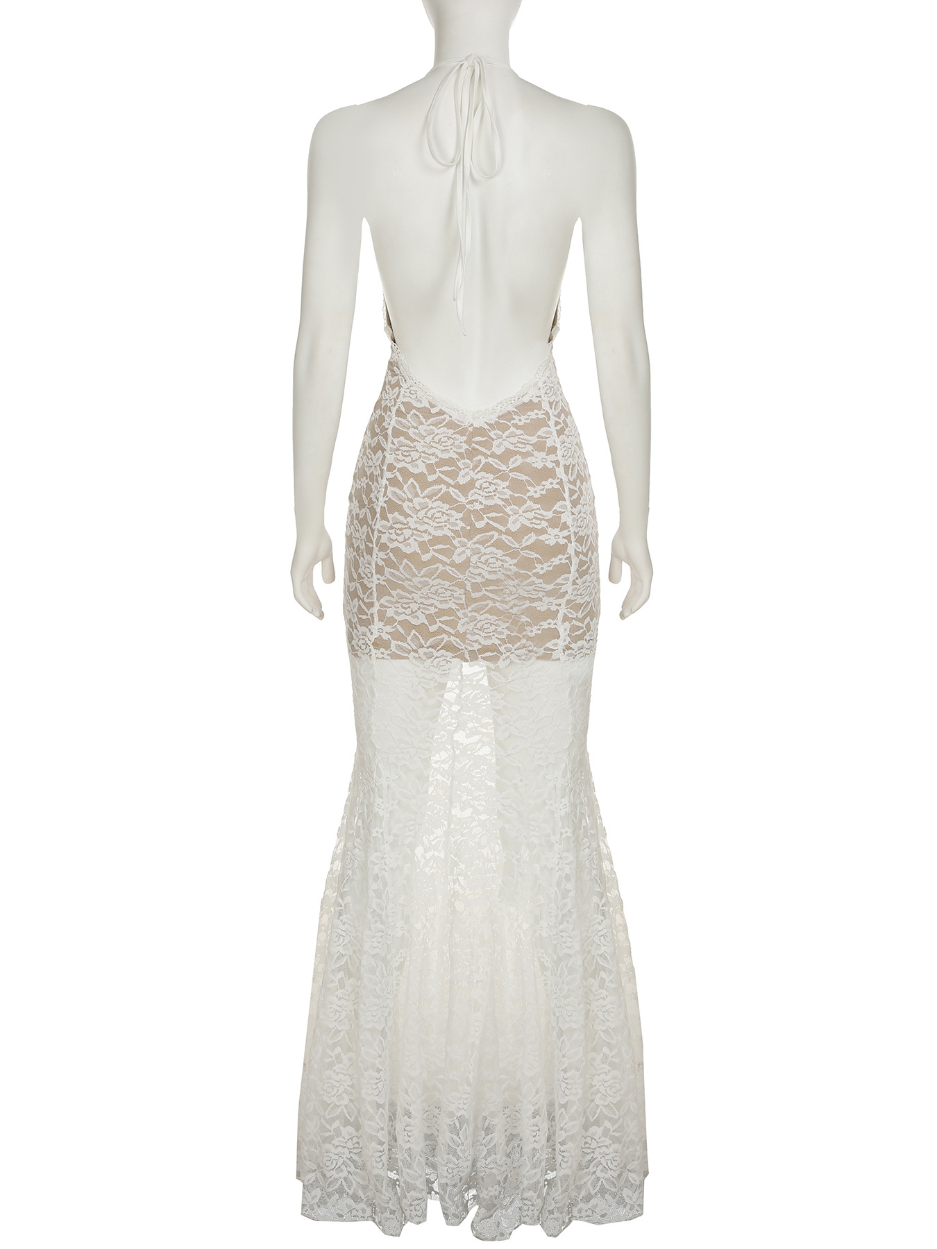 Vacation Sexy Lace Back Hollow Out Cutout out Strap Halter Deep V Plunge neck Slim Fit Dress Sexy See through Dress