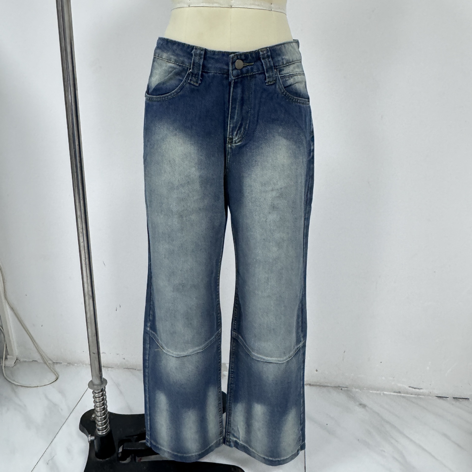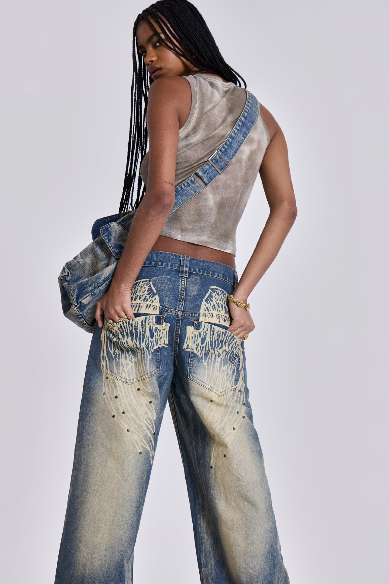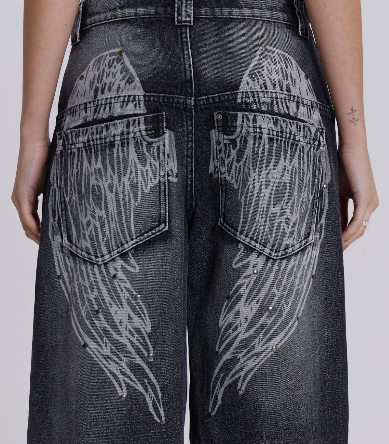 Washed Old Gradient Wings Printing Retro Loose Wide Leg Denim