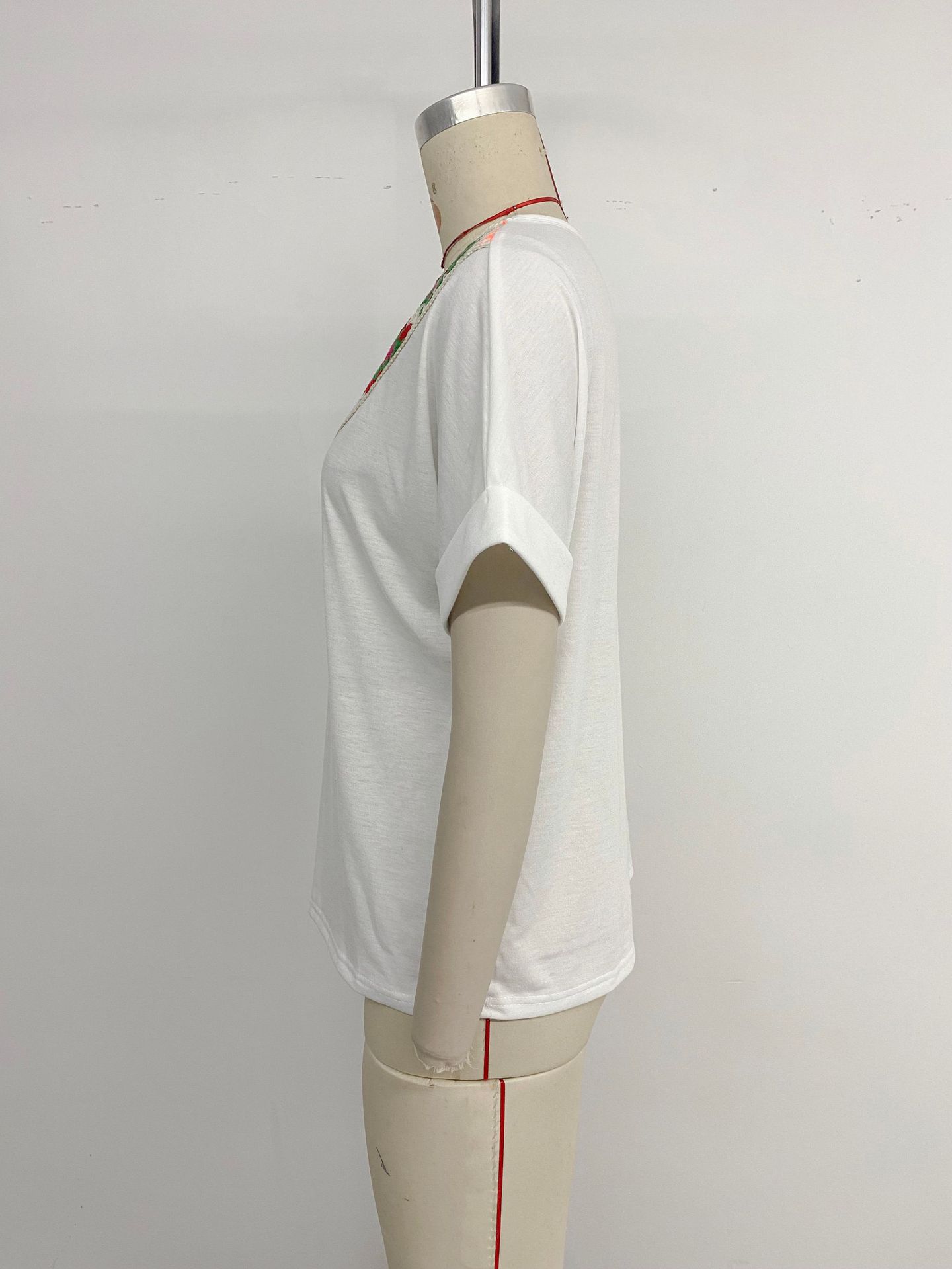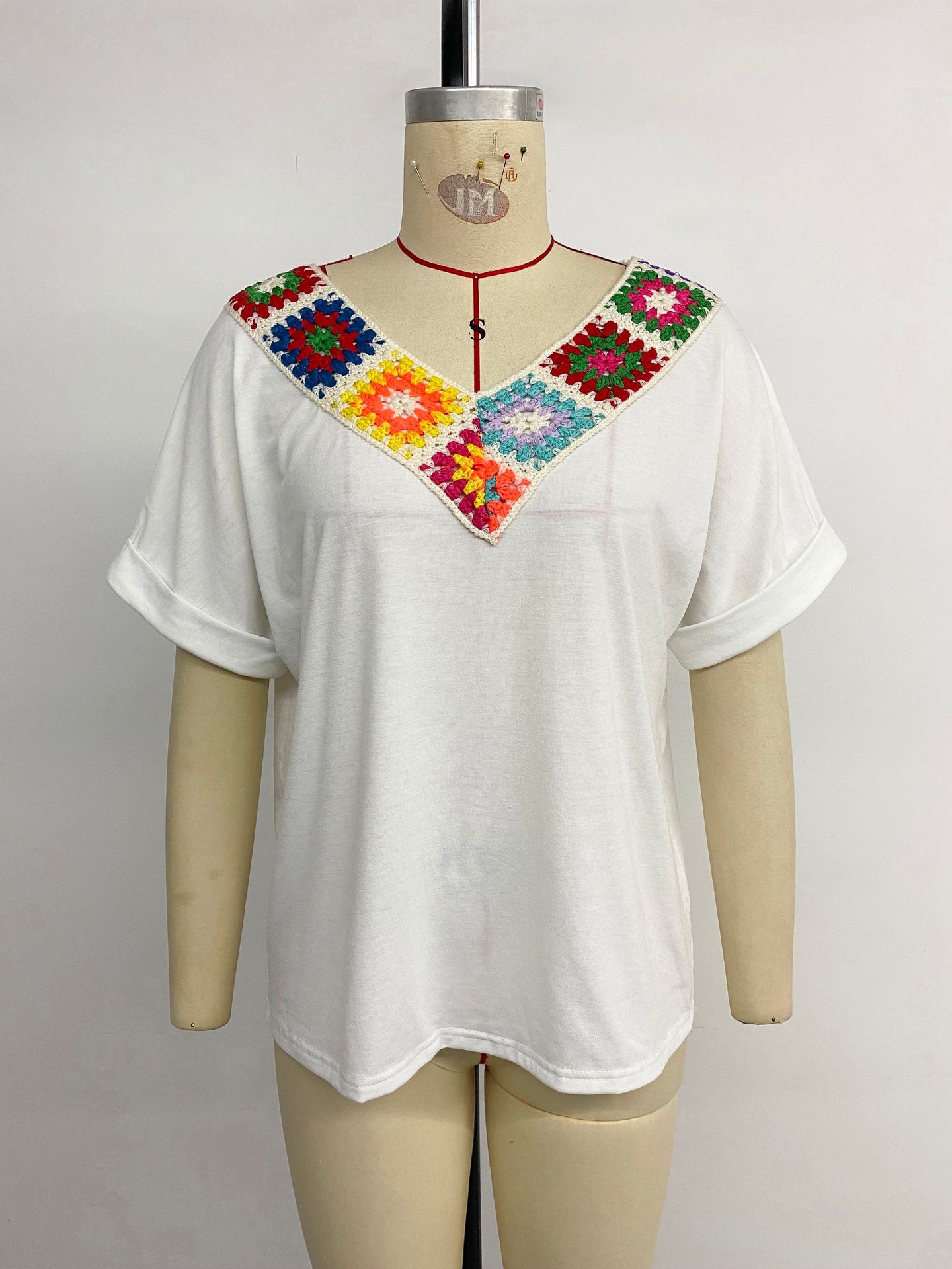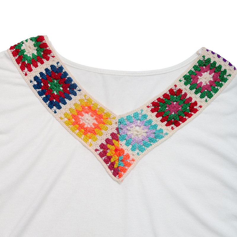 Women Casual Vacation V neck Ethnic Colorful Crochet Patchwork Top