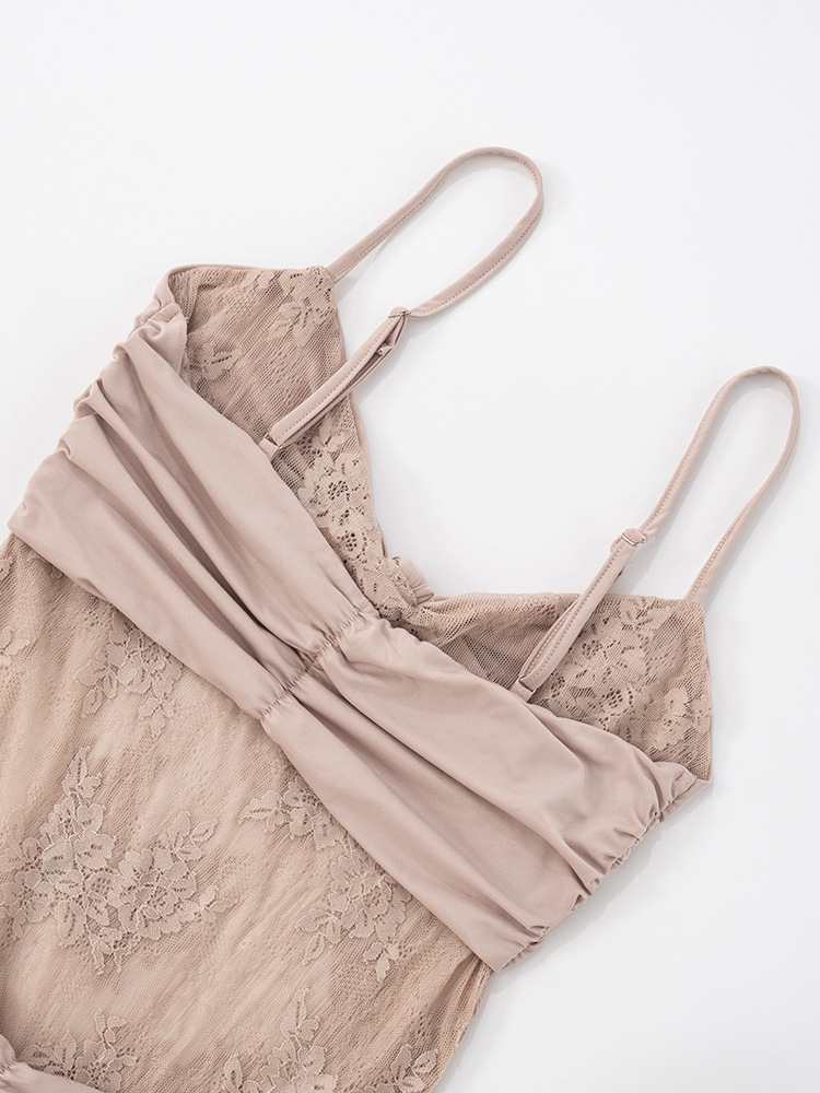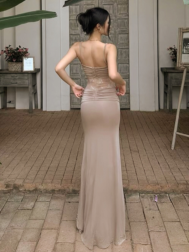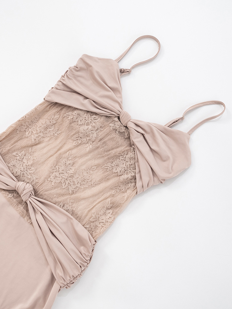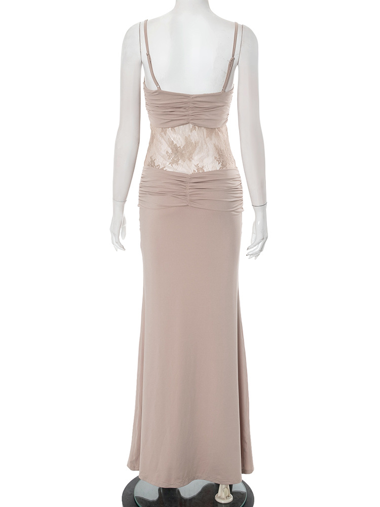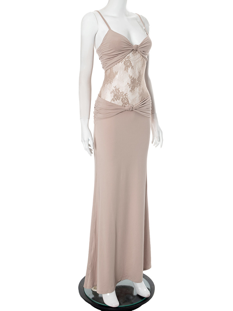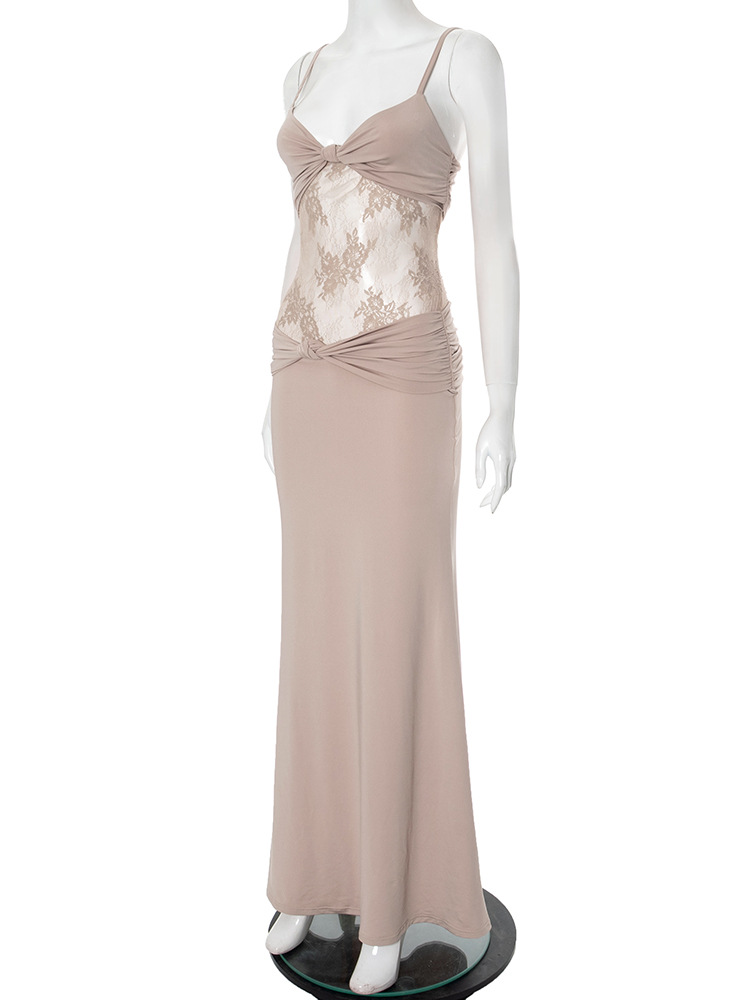 Women Clothing Sleeveless Backless Pleated Twist Slim Lace Stitching Maxi Dress