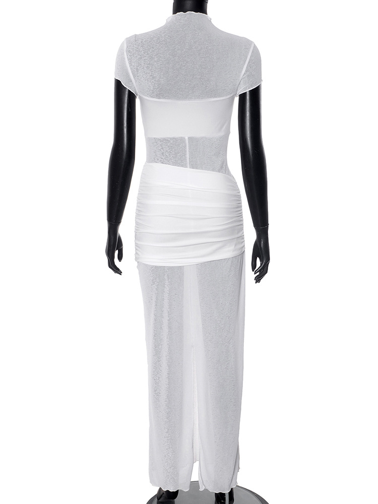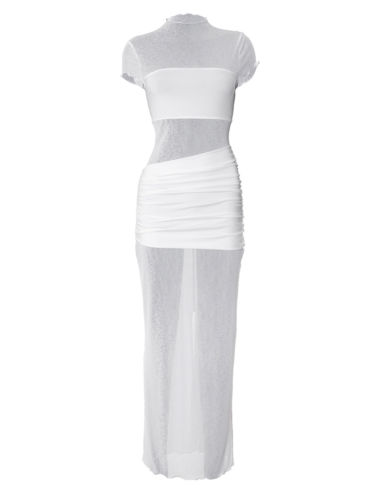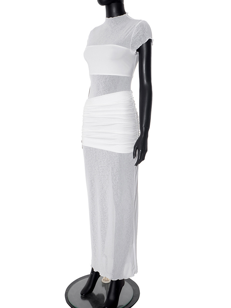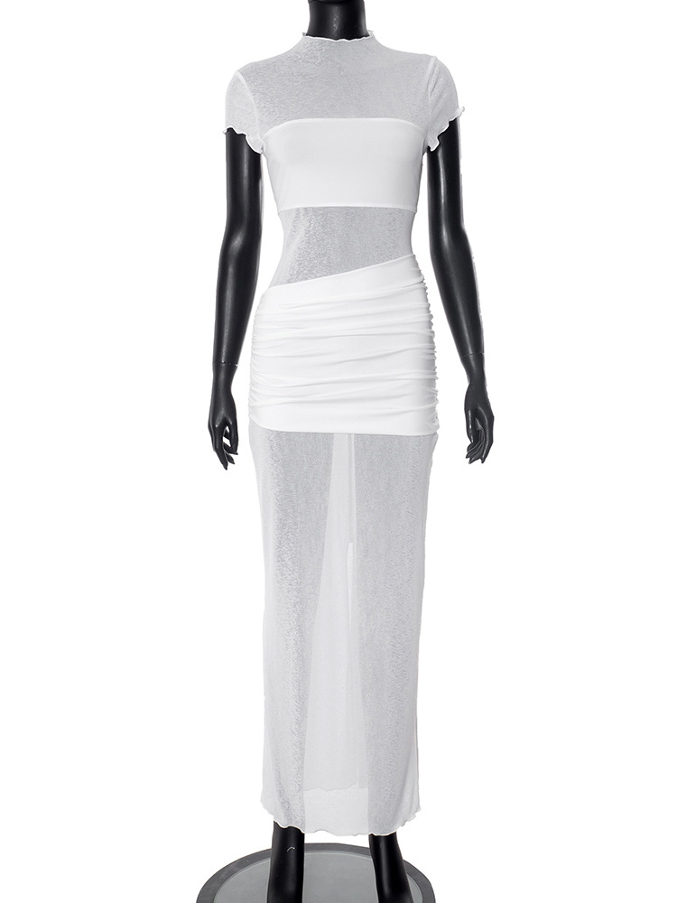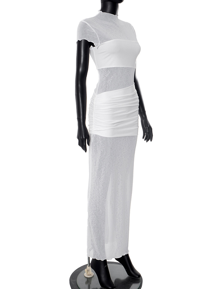 Women Clothing Solid Color round Neck Slim Fit Pullover Sheath Pleated Stitching Maxi Dress