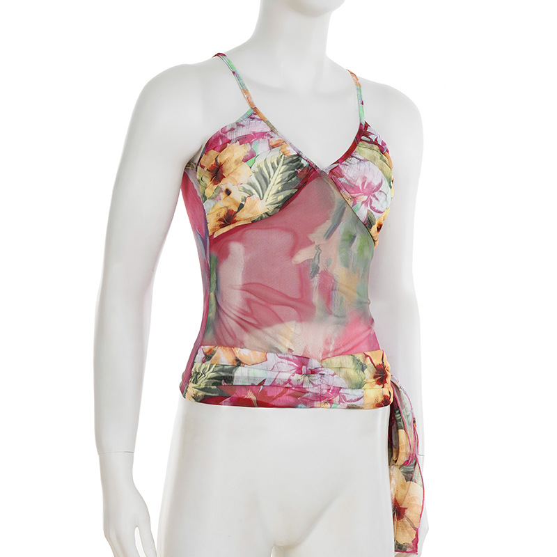 Women Clothing Vacation Color Abstract Printing Pleated V neck Bandage Bow Vest