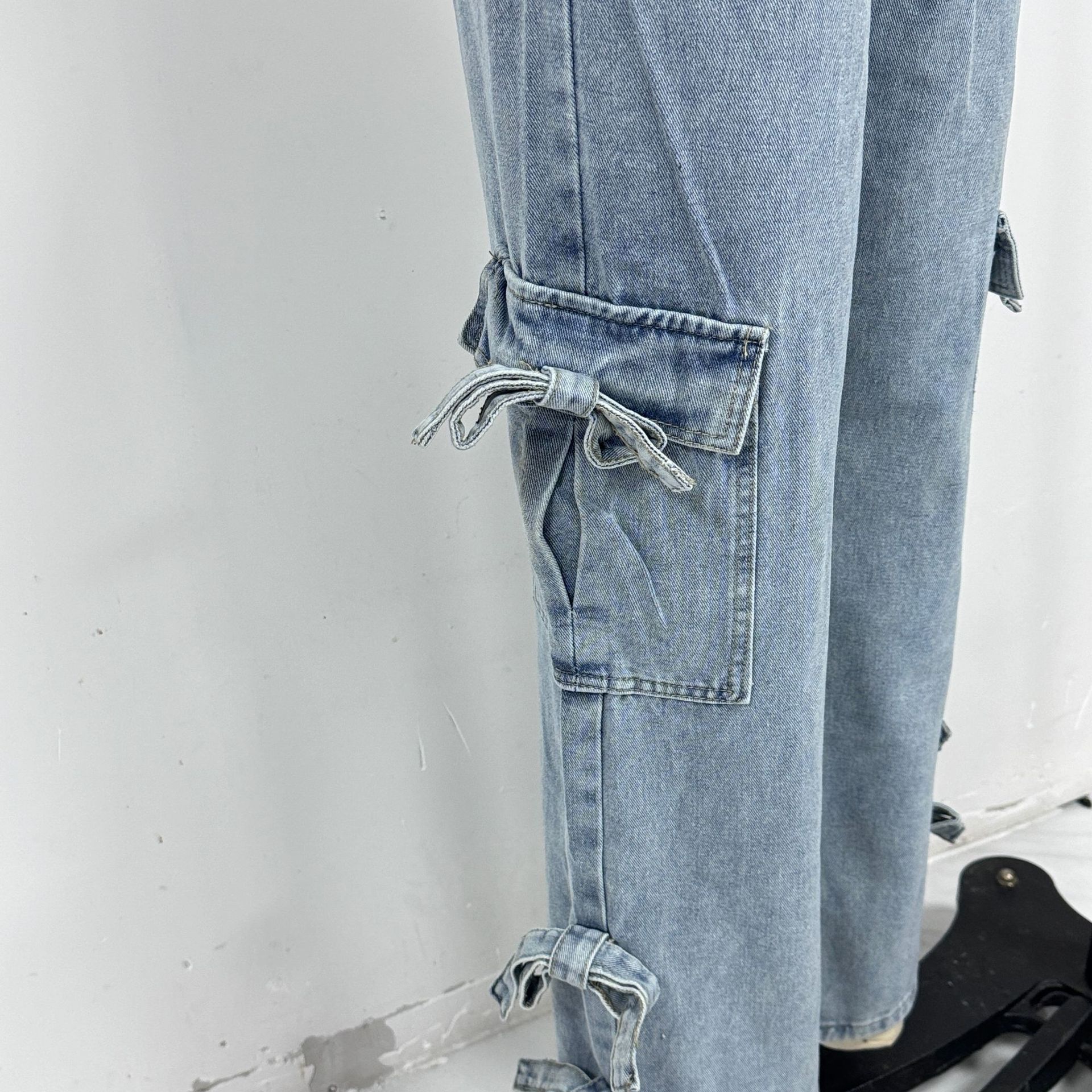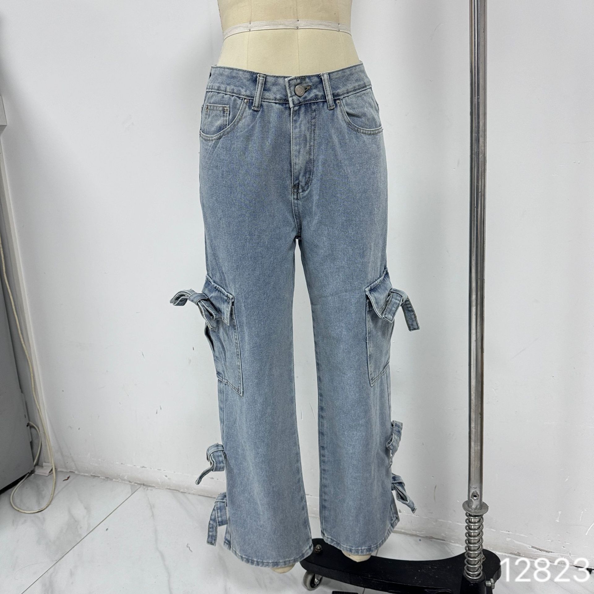 Women Retro Heavy Industry Bow Bandage Mid Waist All Matching Straight Pants